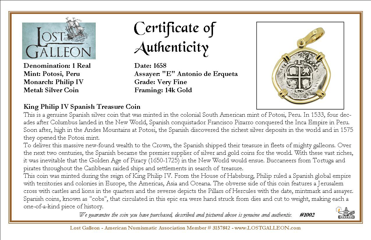This coin was minted during the reign of King Philip IV. From the House of Habsburg, Philip ruled a Spanish global empire with territories and colonies in Europe, the Americas, Asia and Oceana. The obverse side of this coin features a Jerusalem cross with castles and lions in the quarters and the reverse depicts the Pillars of Hercules with the date, mintmark and assayer. Spanish coins, known as "cobs", that circulated in this epic era were hand struck from dies and cut to weight, making each a one-of-a-kind piece of history.