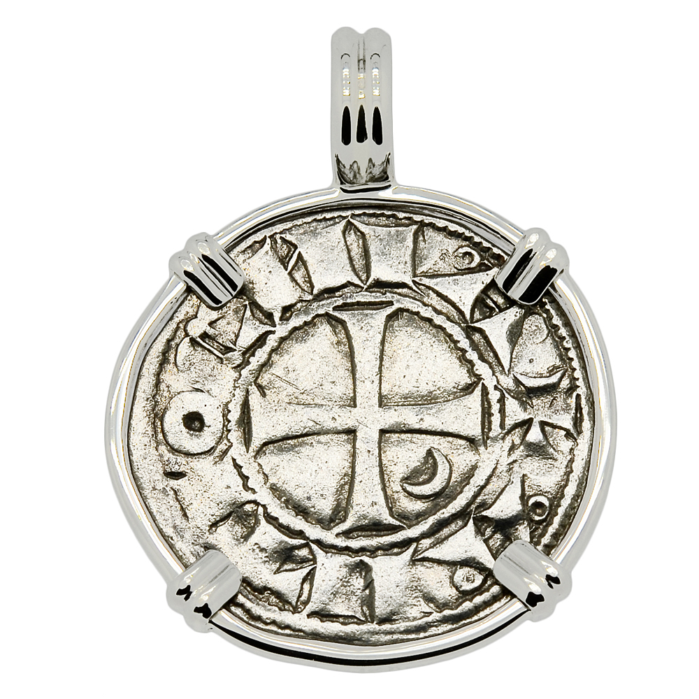 This silver denier coin, hand struck in Antioch, features a Jerusalem Cross or better known as a Crusader Cross. The reverse shows the helmeted head of Bohemond III, who ruled Antioch from 1163 - 1201 and was allied with the Byzantine Empire.