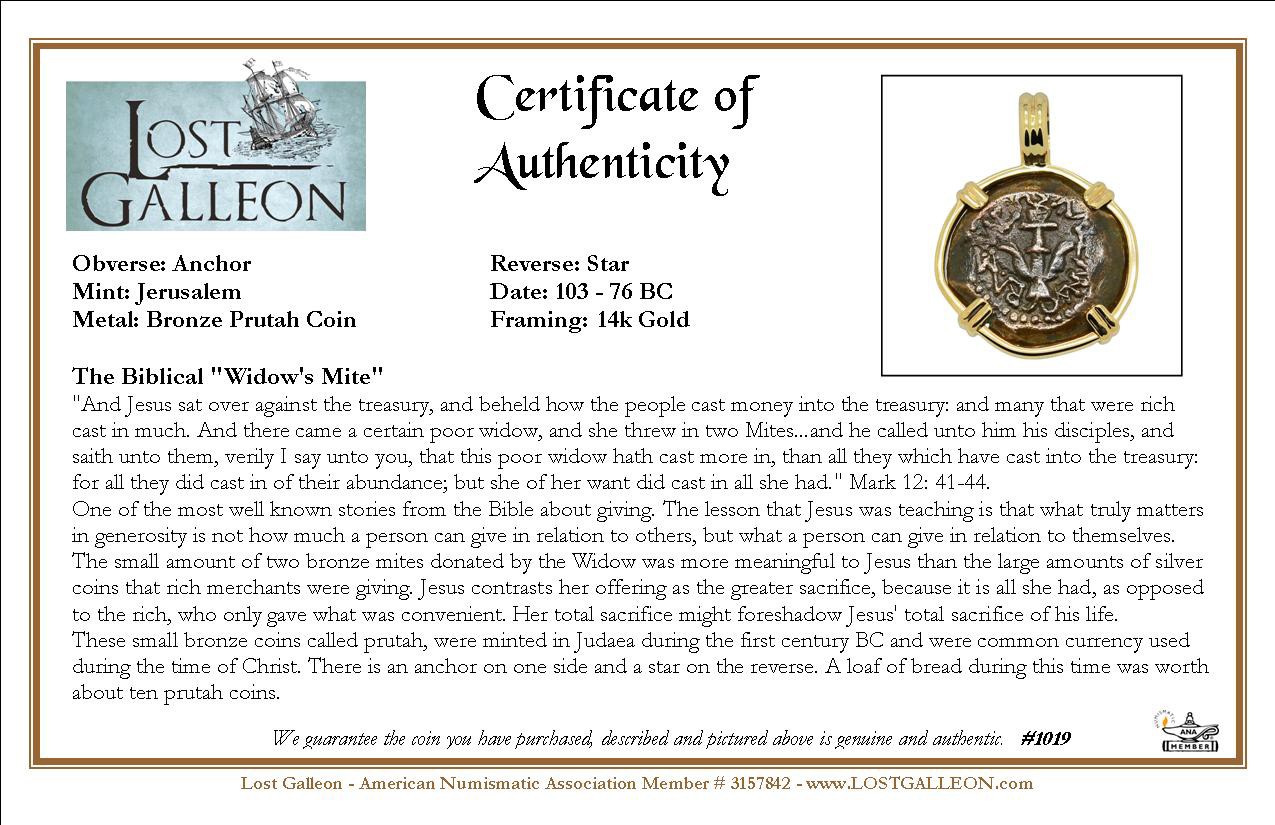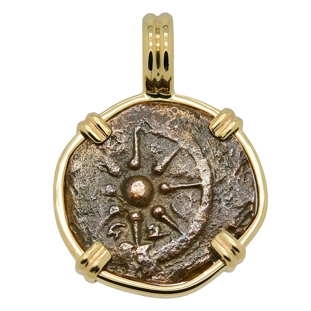 These small bronze coins called prutah, were minted in Judaea during the first century BC and were common currency used during the time of Christ. There is an anchor on one side and a star on the reverse. A loaf of bread during this time was worth about ten prutah coins.