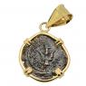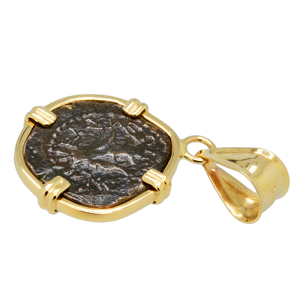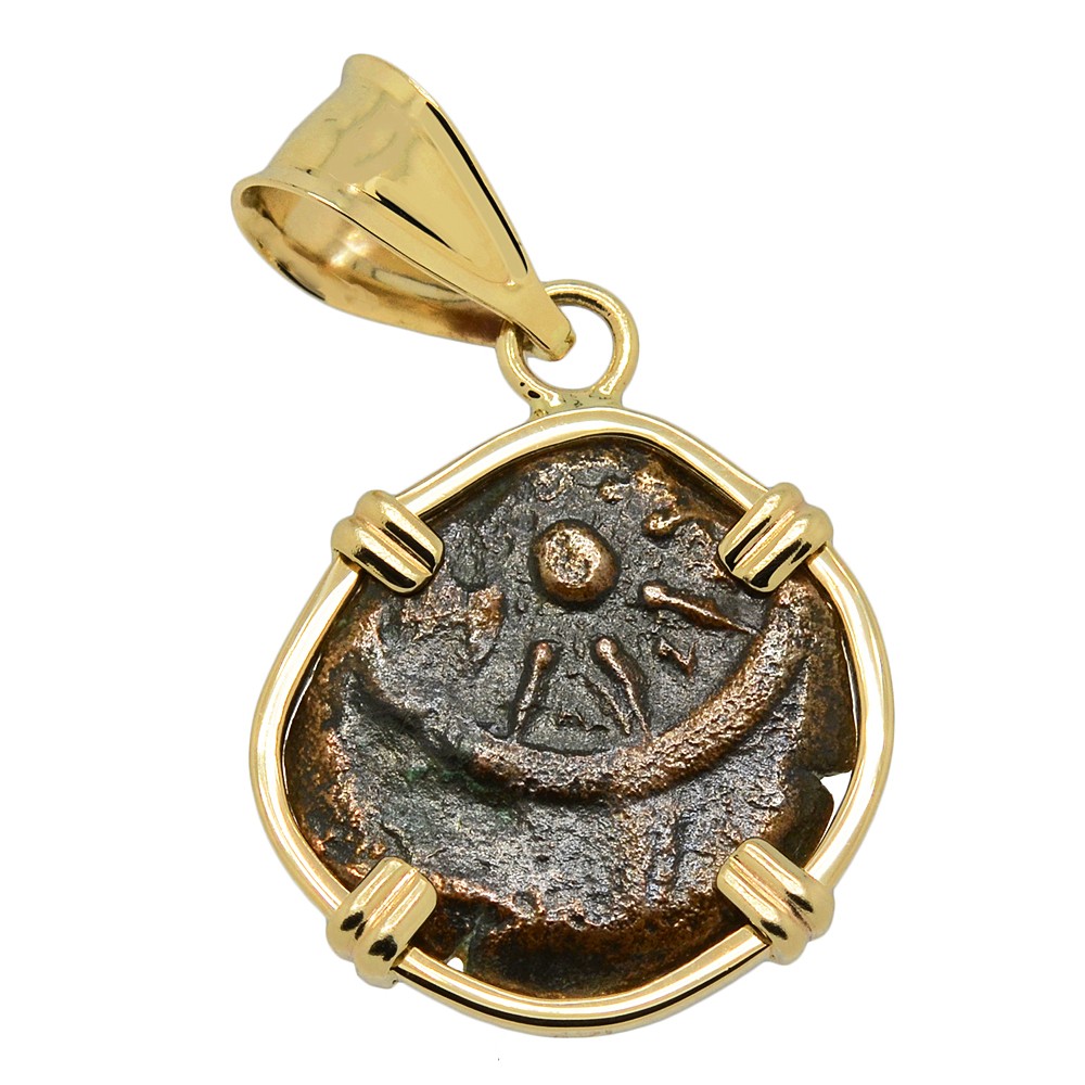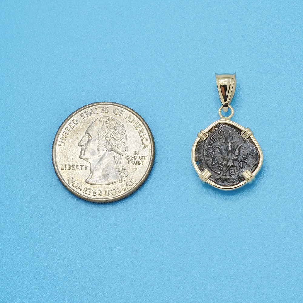 These small bronze coins called prutah, were minted in Judaea during the first century BC and were common currency used during the time of Christ. There is an anchor on one side and a star on the reverse. A loaf of bread during this time was worth about ten prutah coins.