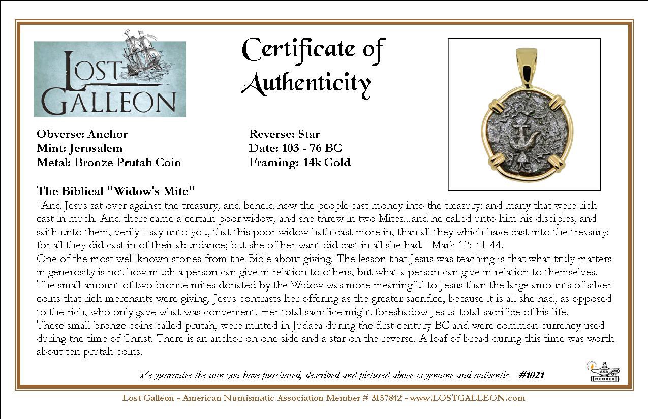 These small bronze coins called prutah, were minted in Judaea during the first century BC and were common currency used during the time of Christ. There is an anchor on one side and a star on the reverse. A loaf of bread during this time was worth about ten prutah coins.