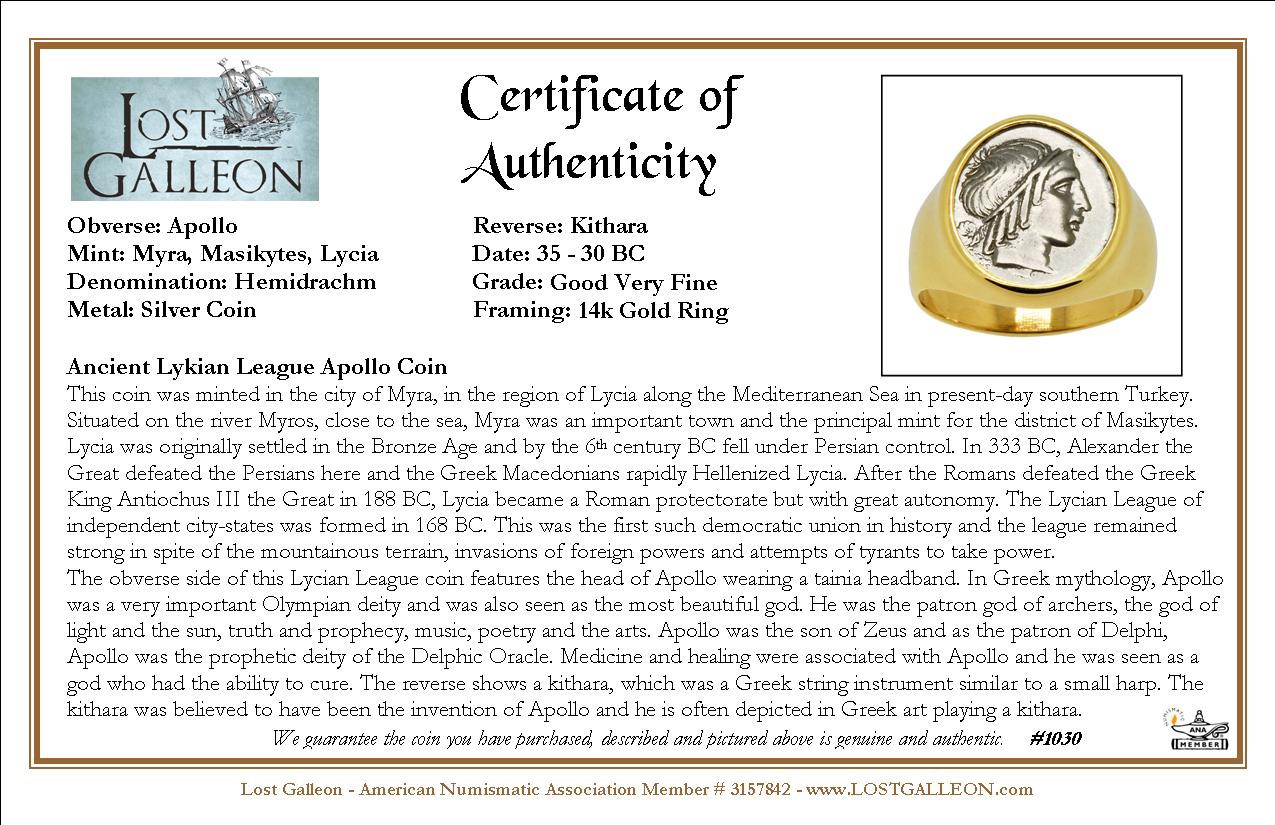 The reverse shows a kithara, which was a Greek string instrument similar to a small harp. The kithara was believed to have been the invention of Apollo and he is often depicted in Greek art playing a kithara.