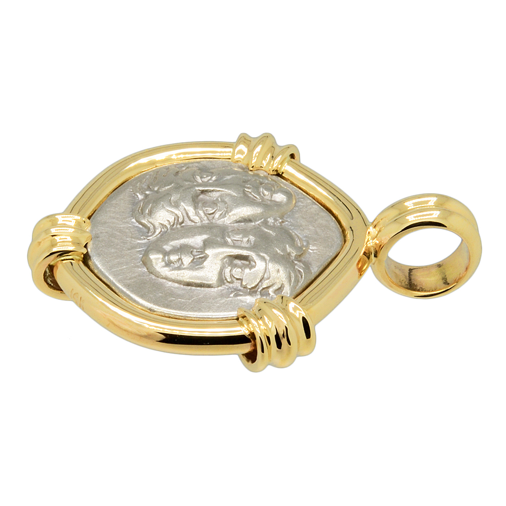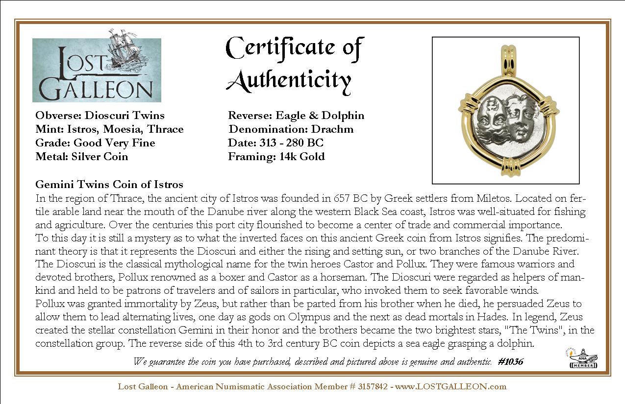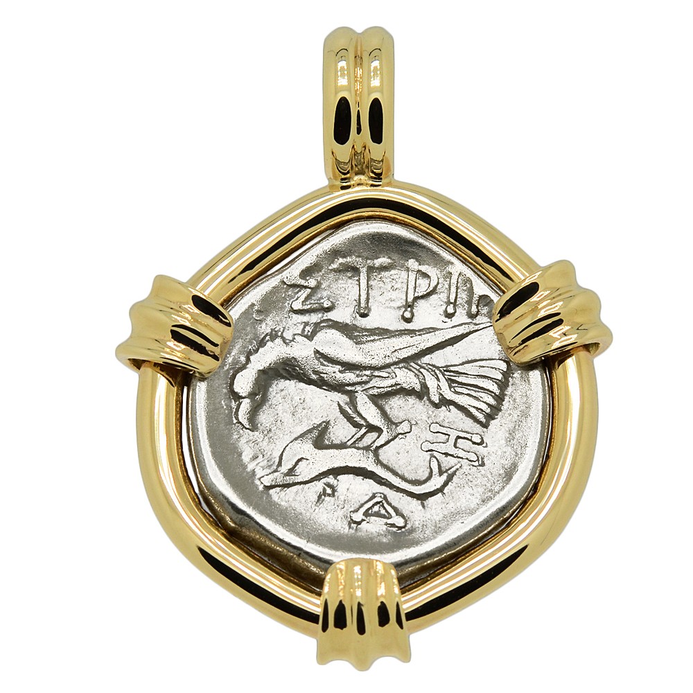 Pollux was granted immortality by Zeus, but rather than be parted from his brother when he died, he persuaded Zeus to allow them to lead alternating lives, one day as gods on Olympus and the next as dead mortals in Hades. In legend, Zeus created the stellar constellation Gemini in their honor and the brothers became the two brightest stars, "The Twins", in the constellation group. The reverse side of this 4th to 3rd century BC coin depicts a sea eagle grasping a dolphin.