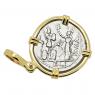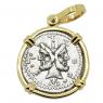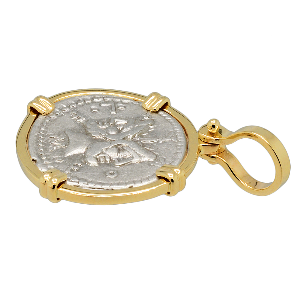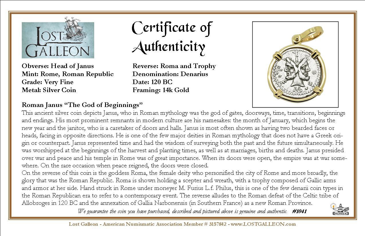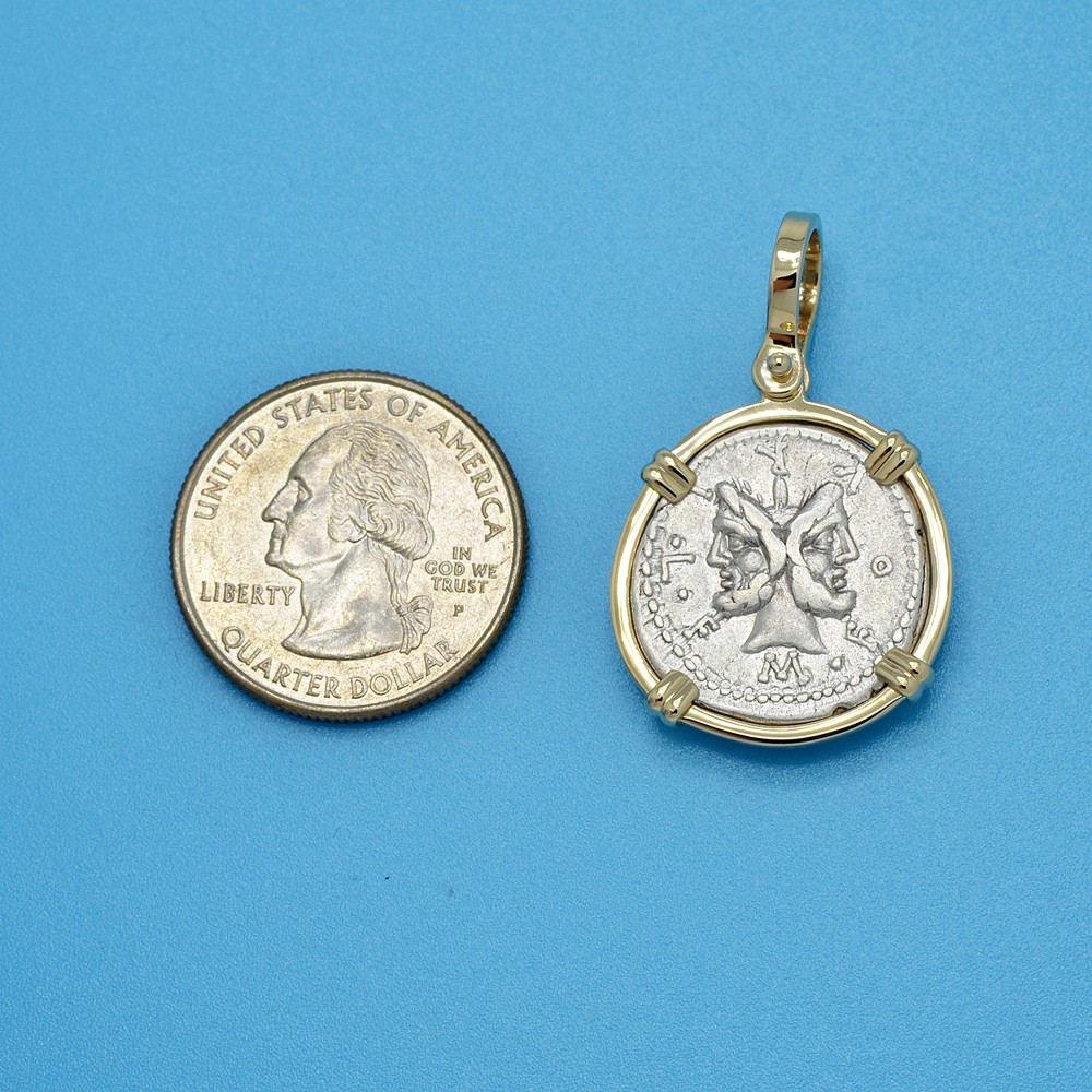 This ancient silver coin depicts Janus, who in Roman mythology was the god of gates, doorways, time, transitions, beginnings and endings. His most prominent remnants in modern culture are his namesakes: the month of January, which begins the new year and the janitor, who is a caretaker of doors and halls. Janus is most often shown as having two bearded faces or heads, facing in opposite directions. He is one of the few major deities in Roman mythology that does not have a Greek origin or counterpart. Janus represented time and had the wisdom of surveying both the past and the future simultaneously. He was worshipped at the beginnings of the harvest and planting times, as well as at marriages, births and deaths. Janus presided over war and peace and his temple in Rome was of great importance. When its doors were open, the empire was at war somewhere. On the rare occasion when peace reigned, the doors were closed.