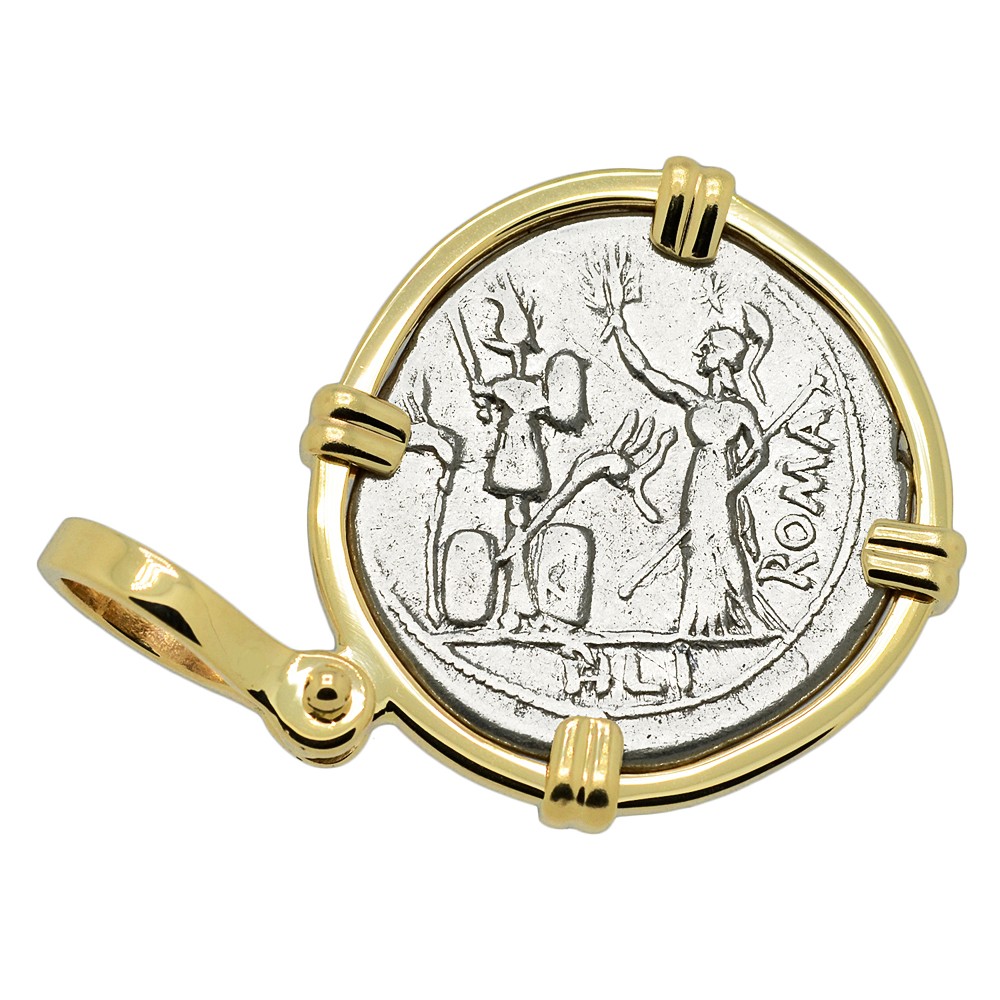 On the reverse of this coin is the goddess Roma, the female deity who personified the city of Rome and more broadly, the glory that was the Roman Republic. Roma is shown holding a scepter and wreath, with a trophy composed of Gallic arms and armor at her side. Hand struck in Rome under moneyer M. Furius L.f. Philus, this is one of the few denarii coin types in the Roman Republican era to refer to a contemporary event. The reverse alludes to the Roman defeat of the Celtic tribe of Allobroges in 120 BC and the annexation of Gallia Narbonensis (in Southern France) as a new Roman Province.