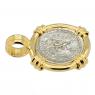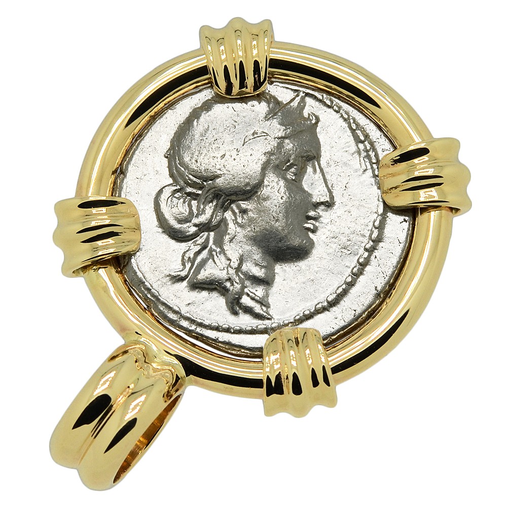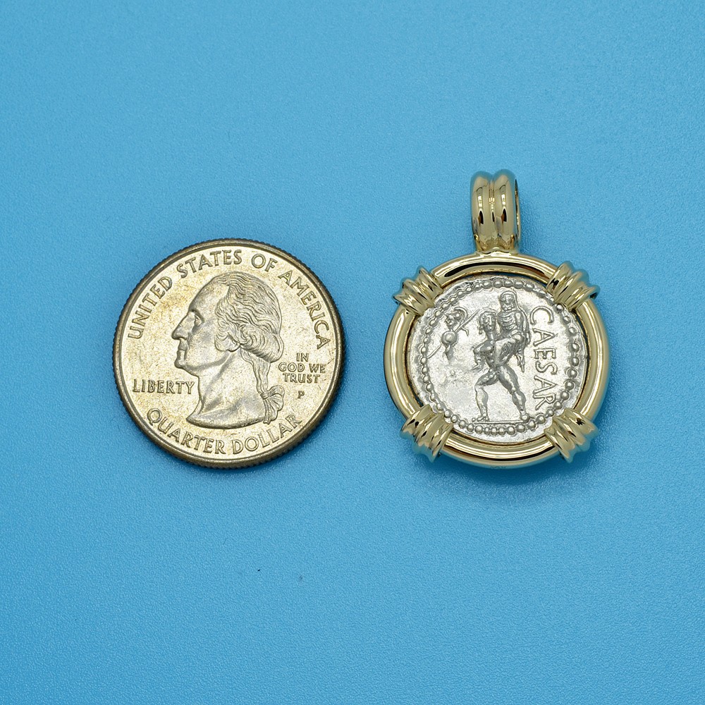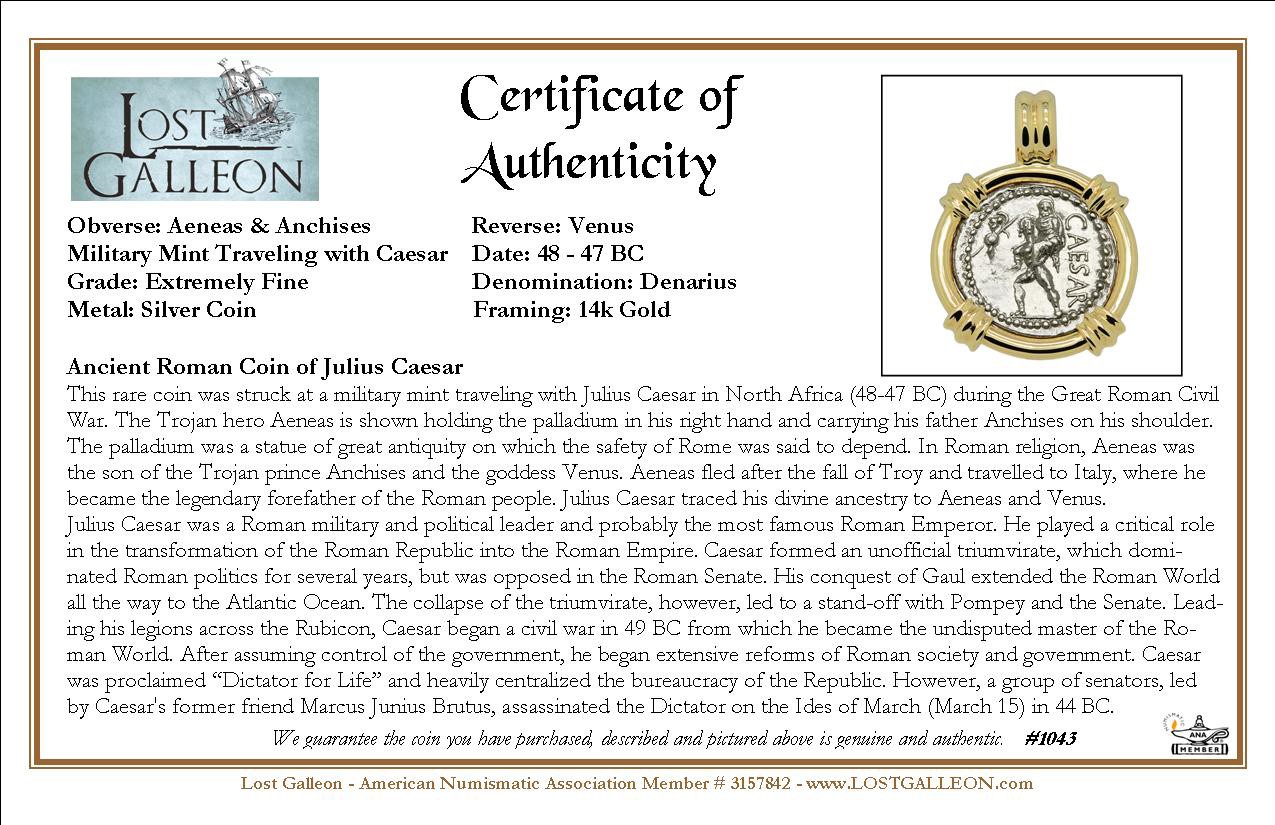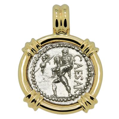 This rare coin was struck at a military mint traveling with Julius Caesar in North Africa (48-47 BC) during the Great Roman Civil War. The Trojan hero Aeneas is shown holding the palladium in his right hand and carrying his father Anchises on his shoulder. The palladium was a statue of great antiquity on which the safety of Rome was said to depend. In Roman religion, Aeneas was the son of the Trojan prince Anchises and the goddess Venus. Aeneas fled after the fall of Troy and travelled to Italy, where he became the legendary forefather of the Roman people. Julius Caesar traced his divine ancestry to Aeneas and Venus.