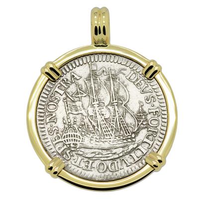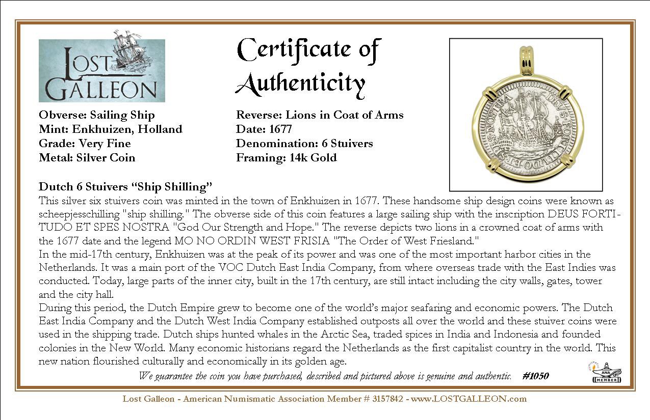 This silver six stuivers coin was minted in the town of Enkhuizen in 1677. These handsome ship design coins were known as scheepjesschilling "ship shilling." The obverse side of this coin features a large sailing ship with the inscription DEUS FORTITUDO ET SPES NOSTRA "God Our Strength and Hope." The reverse depicts two lions in a crowned coat of arms with the 1677 date and the legend MO NO ORDIN WEST FRISIA "The Order of West Friesland."