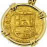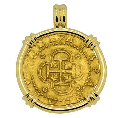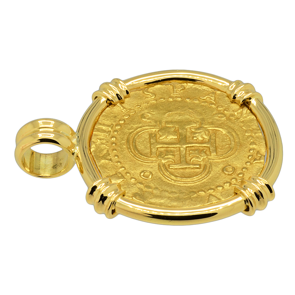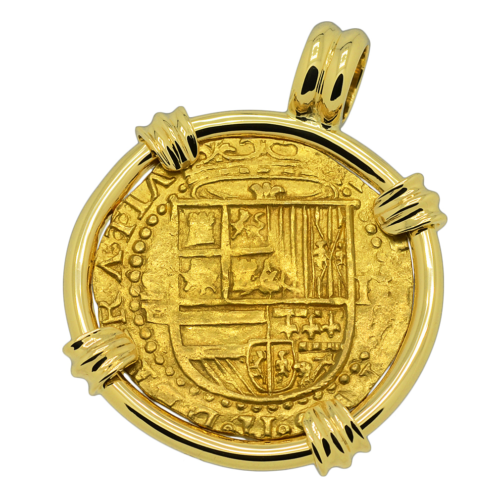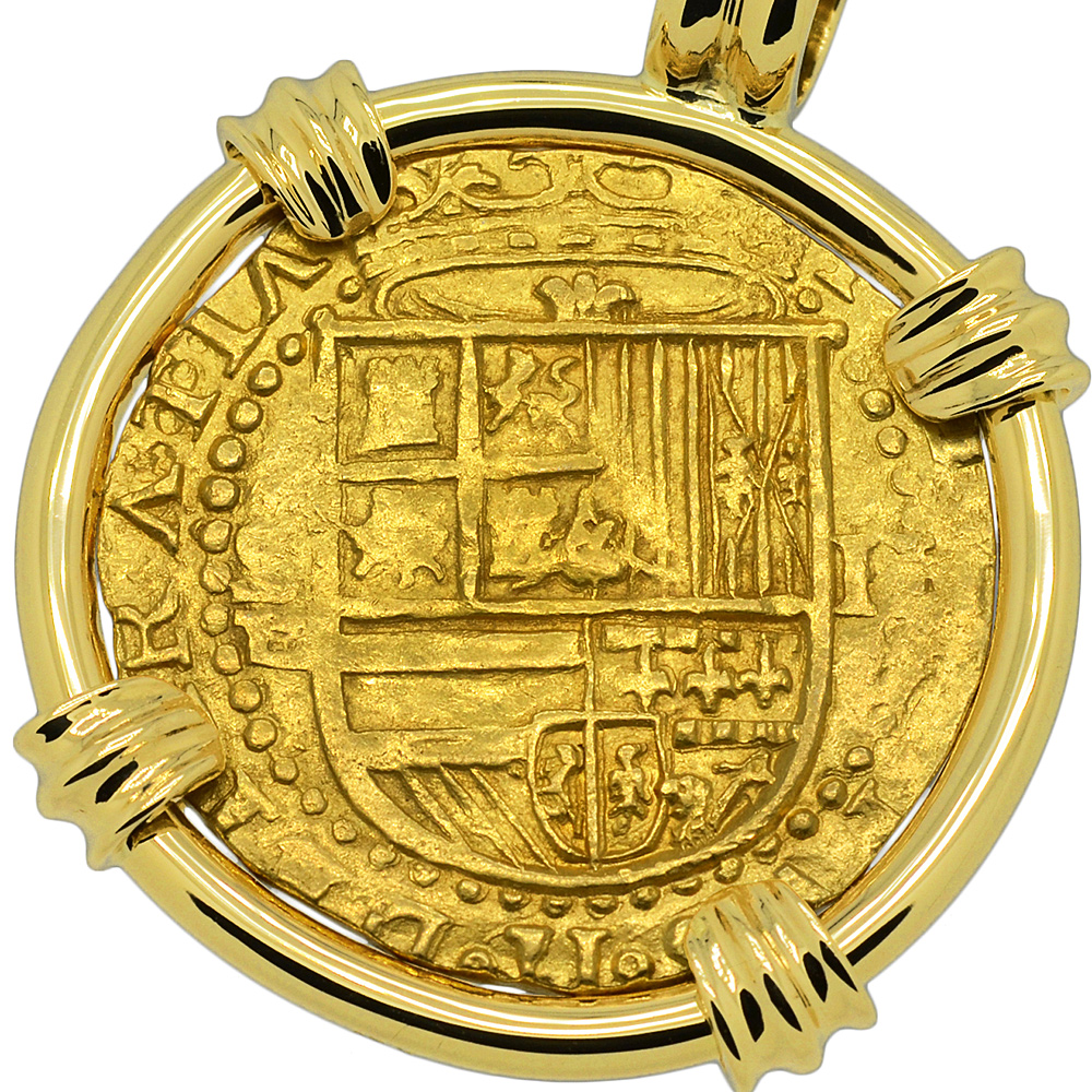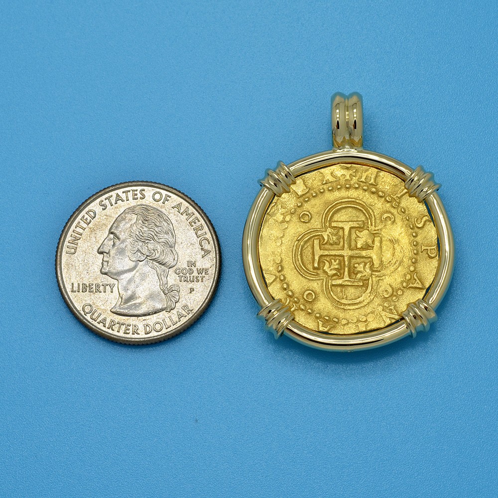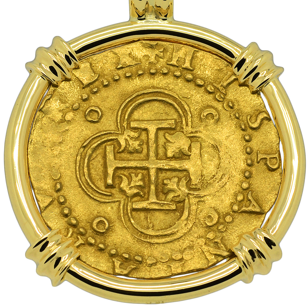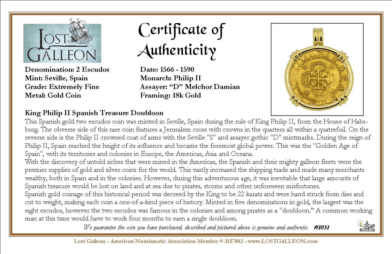 Spanish gold coinage of this historical period was decreed by the King to be 22 karats and were hand struck from dies and cut to weight, making each coin a one-of-a-kind piece of history. Minted in five denominations in gold, the largest was the eight escudos, however the two escudos was famous in the colonies and among pirates as a "doubloon.” A common working man at this time would have to work four months to earn a single doubloon.