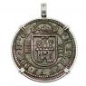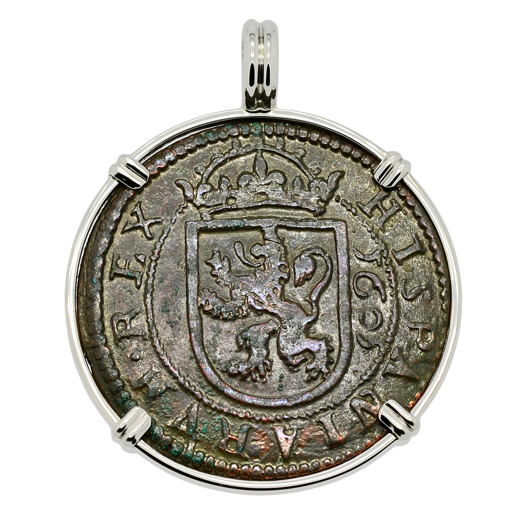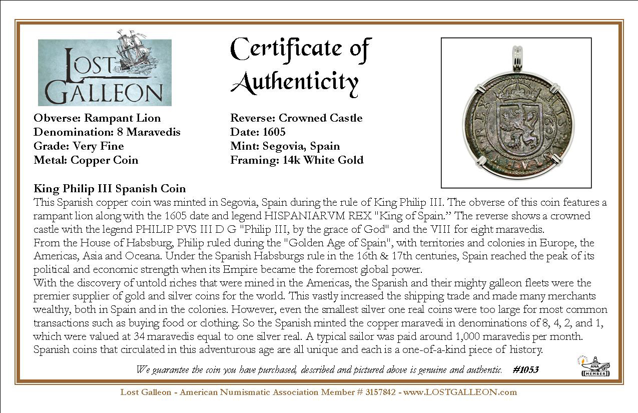 This Spanish copper coin was minted in Segovia, Spain during the rule of King Philip III. The obverse of this coin features a rampant lion along with the 1605 date and legend HISPANIARVM REX "King of Spain.” The reverse shows a crowned castle with the legend PHILIP PVS III D G "Philip III, by the grace of God" and the VIII for eight maravedis.
