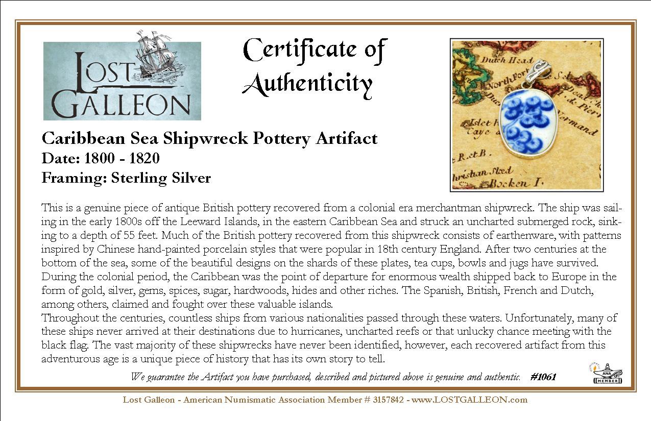This is a genuine piece of antique British pottery recovered from a colonial era merchantman shipwreck. The ship was sailing in the early 1800s off the Leeward Islands, in the eastern Caribbean Sea and struck an uncharted submerged rock, sinking to a depth of 55 feet. Much of the British pottery recovered from this shipwreck consists of earthenware, with patterns inspired by Chinese hand-painted porcelain styles that were popular in 18th century England. After two centuries at the bottom of the sea, some of the beautiful designs on the shards of these plates, tea cups, bowls and jugs have survived.