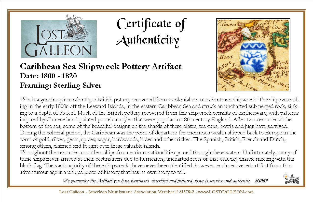 This is a genuine piece of antique British pottery recovered from a colonial era merchantman shipwreck. The ship was sailing in the early 1800s off the Leeward Islands, in the eastern Caribbean Sea and struck an uncharted submerged rock, sinking to a depth of 55 feet. Much of the British pottery recovered from this shipwreck consists of earthenware, with patterns inspired by Chinese hand-painted porcelain styles that were popular in 18th century England. After two centuries at the bottom of the sea, some of the beautiful designs on the shards of these plates, tea cups, bowls and jugs have survived.