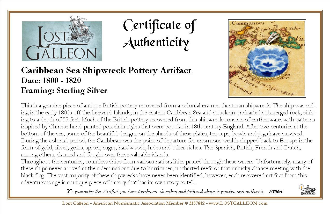 This is a genuine piece of antique British pottery recovered from a colonial era merchantman shipwreck. The ship was sailing in the early 1800s off the Leeward Islands, in the eastern Caribbean Sea and struck an uncharted submerged rock, sinking to a depth of 55 feet. Much of the British pottery recovered from this shipwreck consists of earthenware, with patterns inspired by Chinese hand-painted porcelain styles that were popular in 18th century England. After two centuries at the bottom of the sea, some of the beautiful designs on the shards of these plates, tea cups, bowls and jugs have survived.
