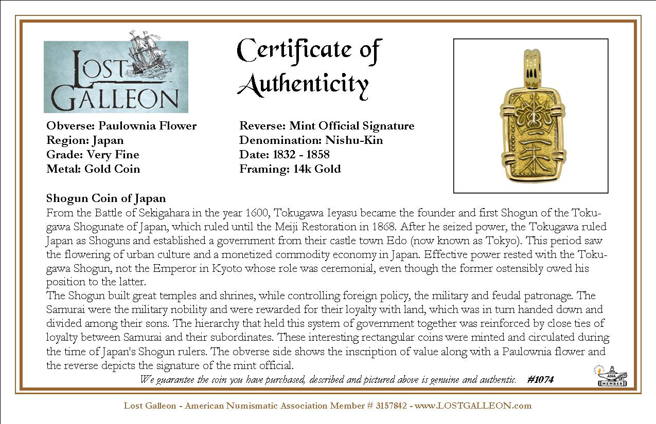 The Shogun built great temples and shrines, while controlling foreign policy, the military and feudal patronage. The Samurai were the military nobility and were rewarded for their loyalty with land, which was in turn handed down and divided among their sons. The hierarchy that held this system of government together was reinforced by close ties of loyalty between Samurai and their subordinates. These interesting rectangular coins were minted and circulated during the time of Japan's Shogun rulers. The obverse side shows the inscription of value along with a Paulownia flower and the reverse depicts the signature of the mint official.