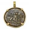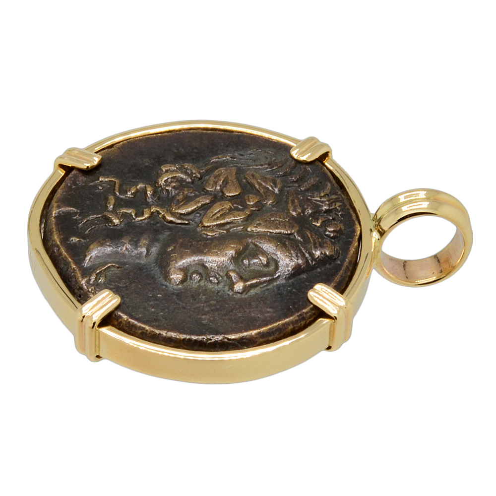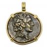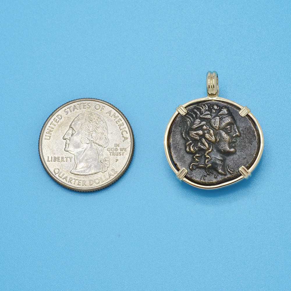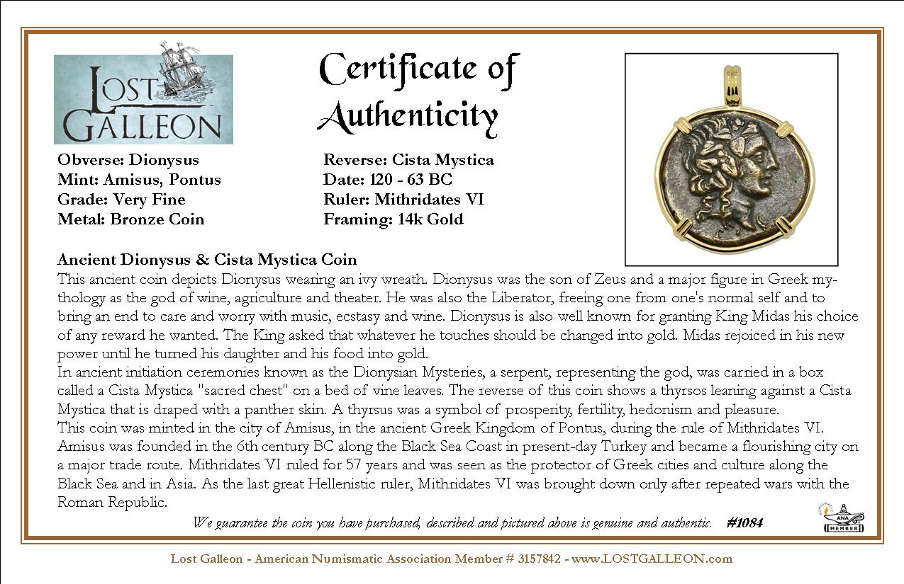 This ancient coin depicts Dionysus wearing an ivy wreath. Dionysus was the son of Zeus and a major figure in Greek mythology as the god of wine, agriculture and theater. He was also the Liberator, freeing one from one's normal self and to bring an end to care and worry with music, ecstasy and wine. Dionysus is also well known for granting King Midas his choice of any reward he wanted. The King asked that whatever he touches should be changed into gold. Midas rejoiced in his new power until he turned his daughter and his food into gold.