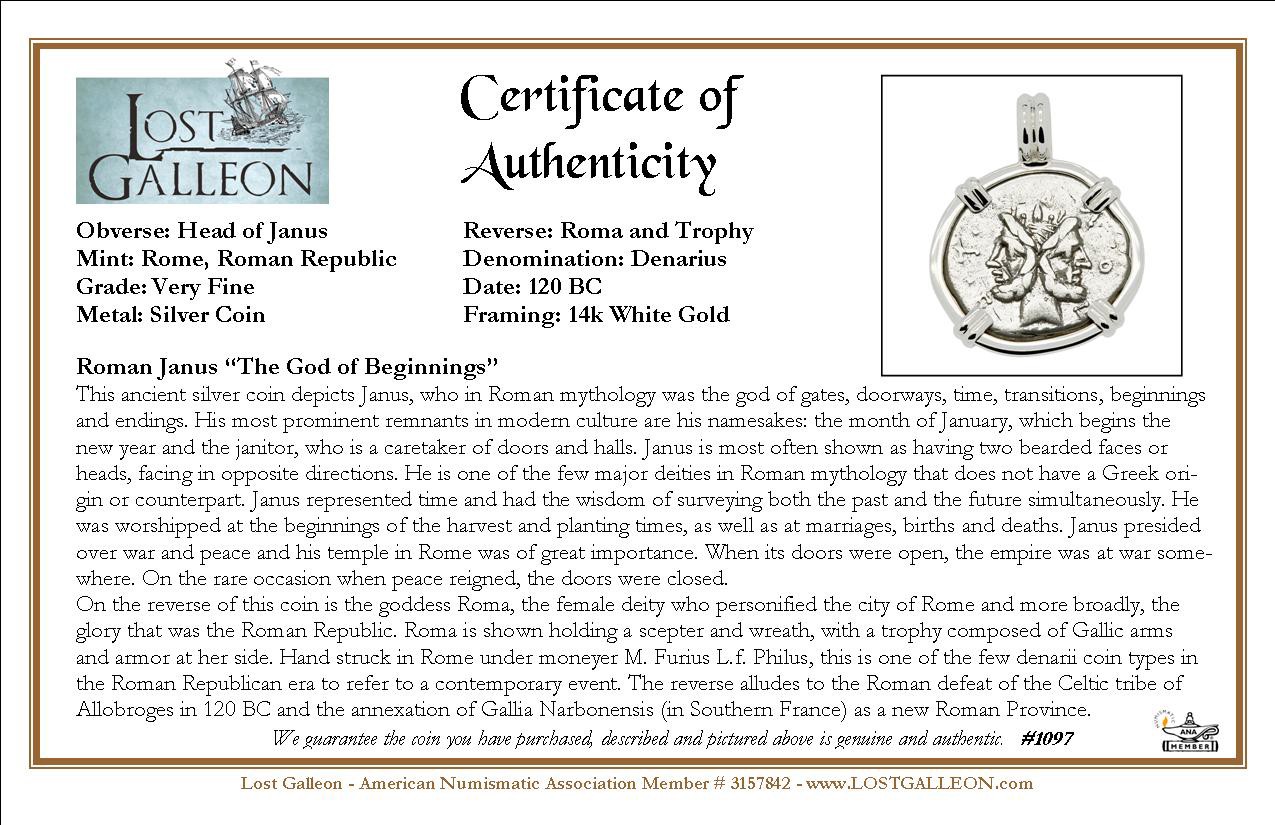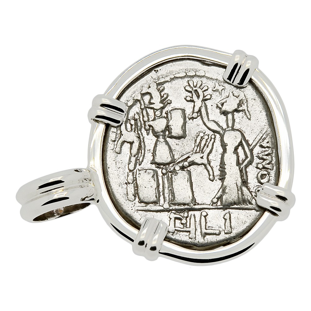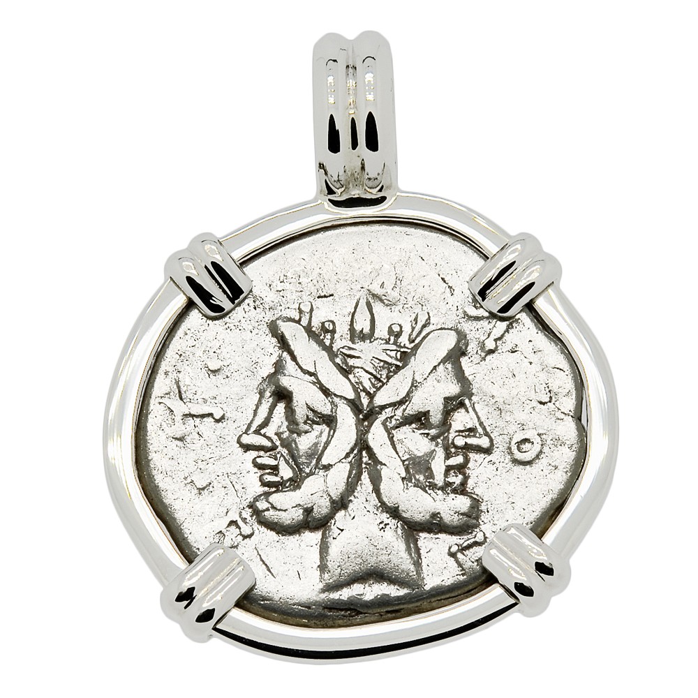 This ancient silver coin depicts Janus, who in Roman mythology was the god of gates, doorways, time, transitions, beginnings and endings. His most prominent remnants in modern culture are his namesakes: the month of January, which begins the new year and the janitor, who is a caretaker of doors and halls. Janus is most often shown as having two bearded faces or heads, facing in opposite directions. He is one of the few major deities in Roman mythology that does not have a Greek origin or counterpart.