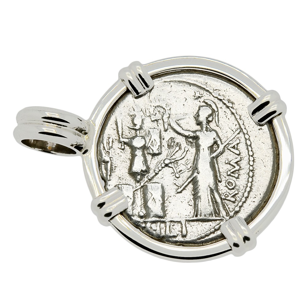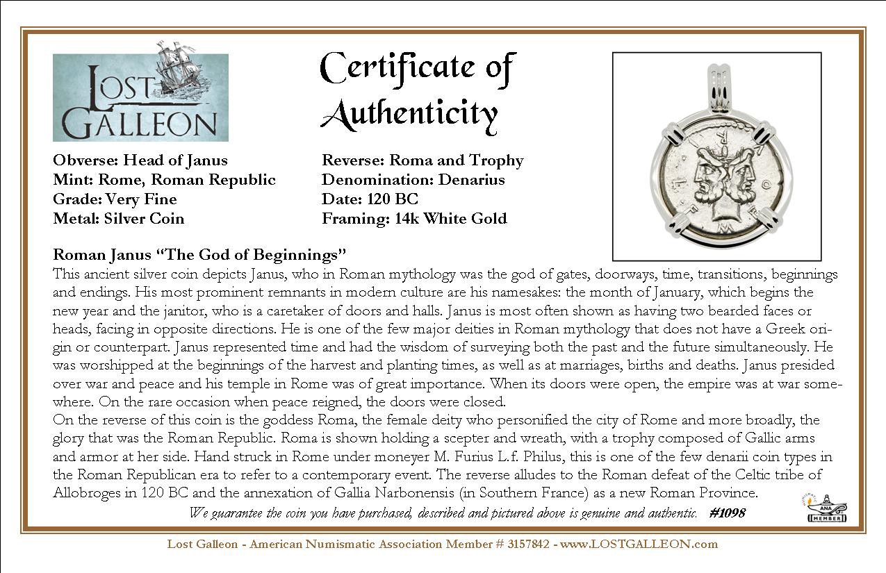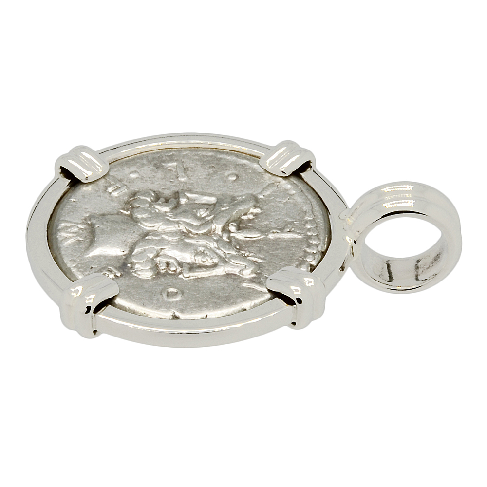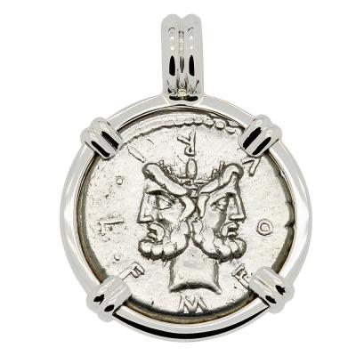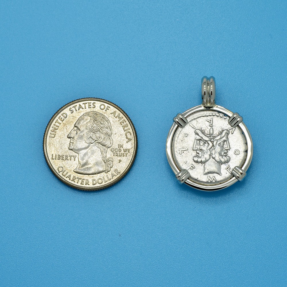 This ancient silver coin depicts Janus, who in Roman mythology was the god of gates, doorways, time, transitions, beginnings and endings. His most prominent remnants in modern culture are his namesakes: the month of January, which begins the new year and the janitor, who is a caretaker of doors and halls. Janus is most often shown as having two bearded faces or heads, facing in opposite directions. He is one of the few major deities in Roman mythology that does not have a Greek origin or counterpart.