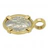 The reverse side of this coin shows Salus draped and seated while she is feeding a coiled serpent. Salus, meaning "salvation" in Latin, was the goddess of well-being, health and prosperity for both the people and the Roman Empire.
