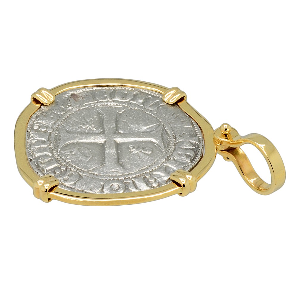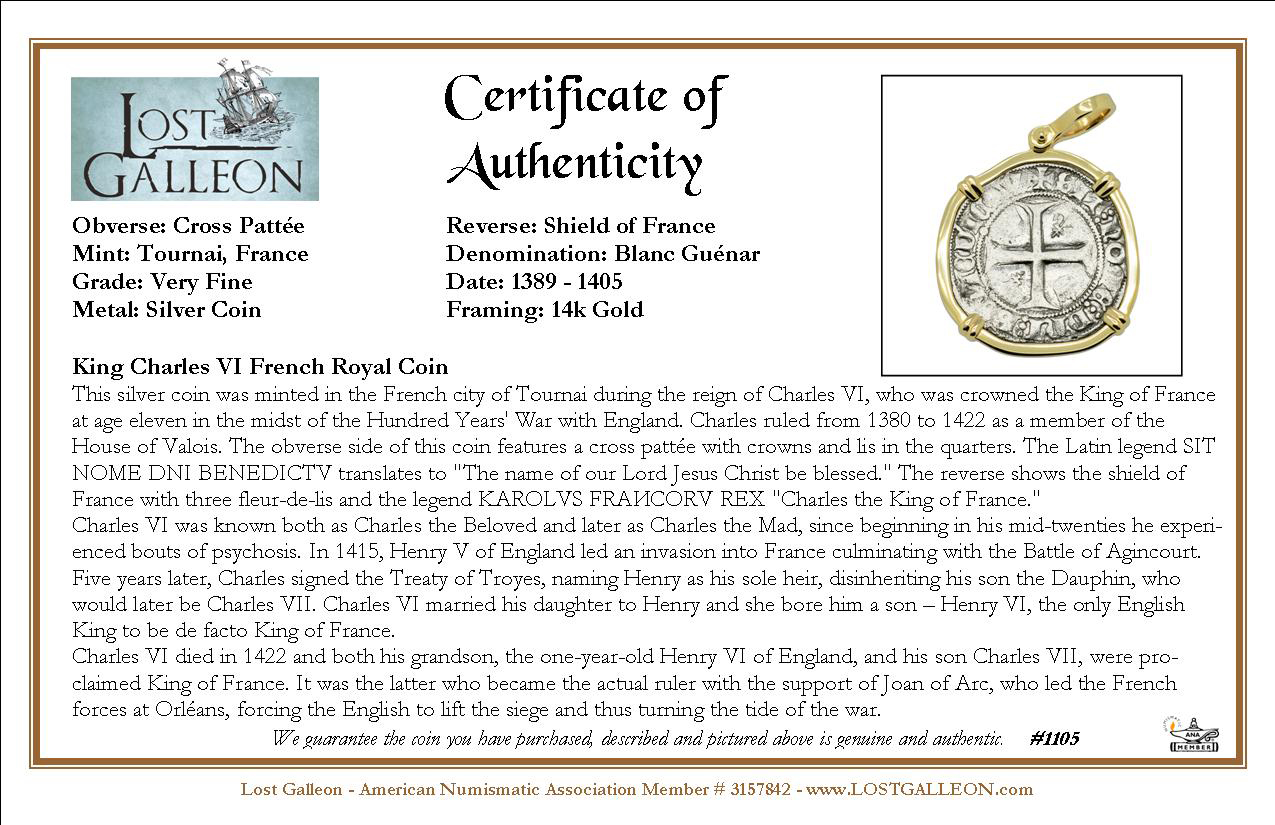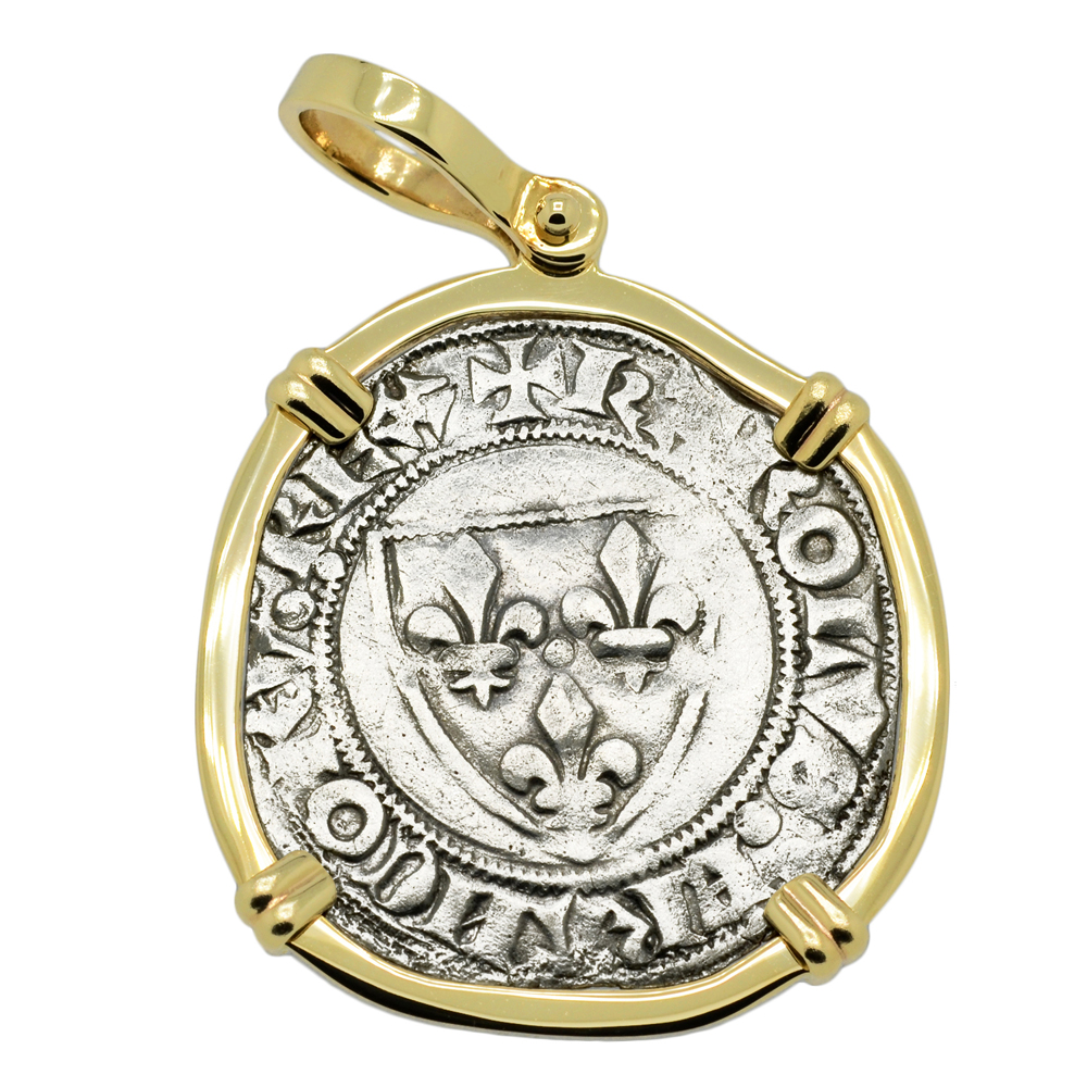 This silver coin was minted in the French city of Tournai during the reign of Charles VI, who was crowned the King of France at age eleven in the midst of the Hundred Years' War with England. Charles ruled from 1380 to 1422 as a member of the House of Valois. The obverse side of this coin features a cross pattée with crowns and lis in the quarters. The Latin legend SIT NOME DNI BENEDICTV translates to "The name of our Lord Jesus Christ be blessed." The reverse shows the shield of France with three fleur-de-lis and the legend KAROLVS FRAИCORV REX "Charles the King of France."