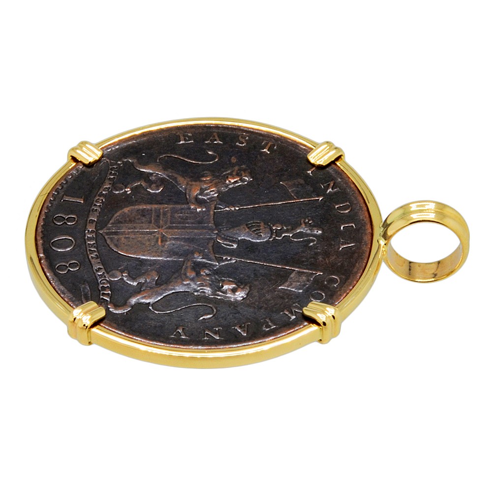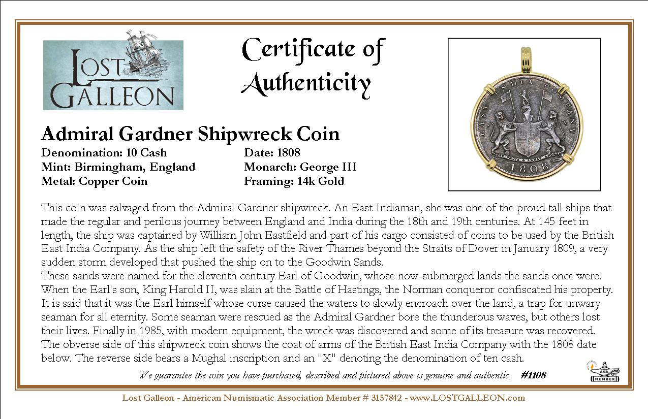 This coin was salvaged from the Admiral Gardner shipwreck. An East Indiaman, she was one of the proud tall ships that made the regular and perilous journey between England and India during the 18th and 19th centuries. At 145 feet in length, the ship was captained by William John Eastfield and part of his cargo consisted of coins to be used by the British East India Company. As the ship left the safety of the River Thames beyond the Straits of Dover in January 1809, a very sudden storm developed that pushed the ship on to the Goodwin Sands.