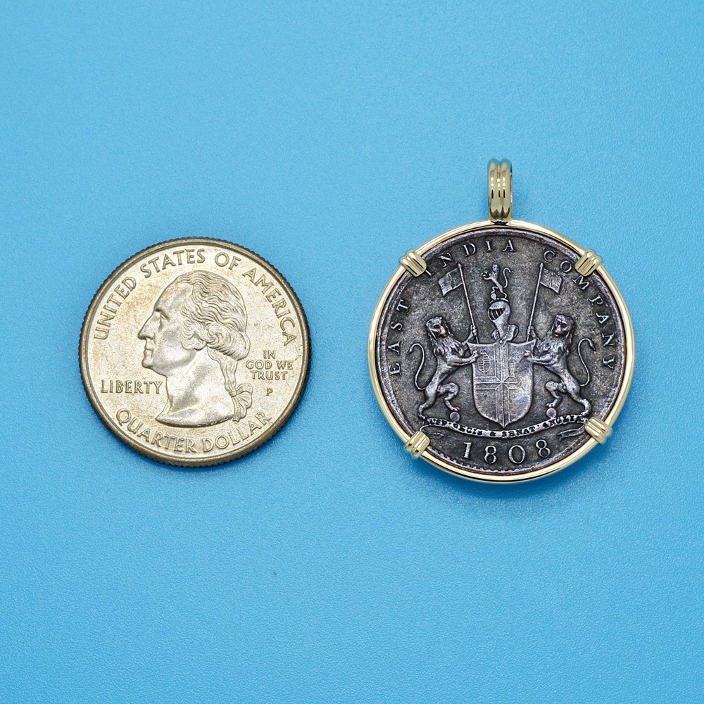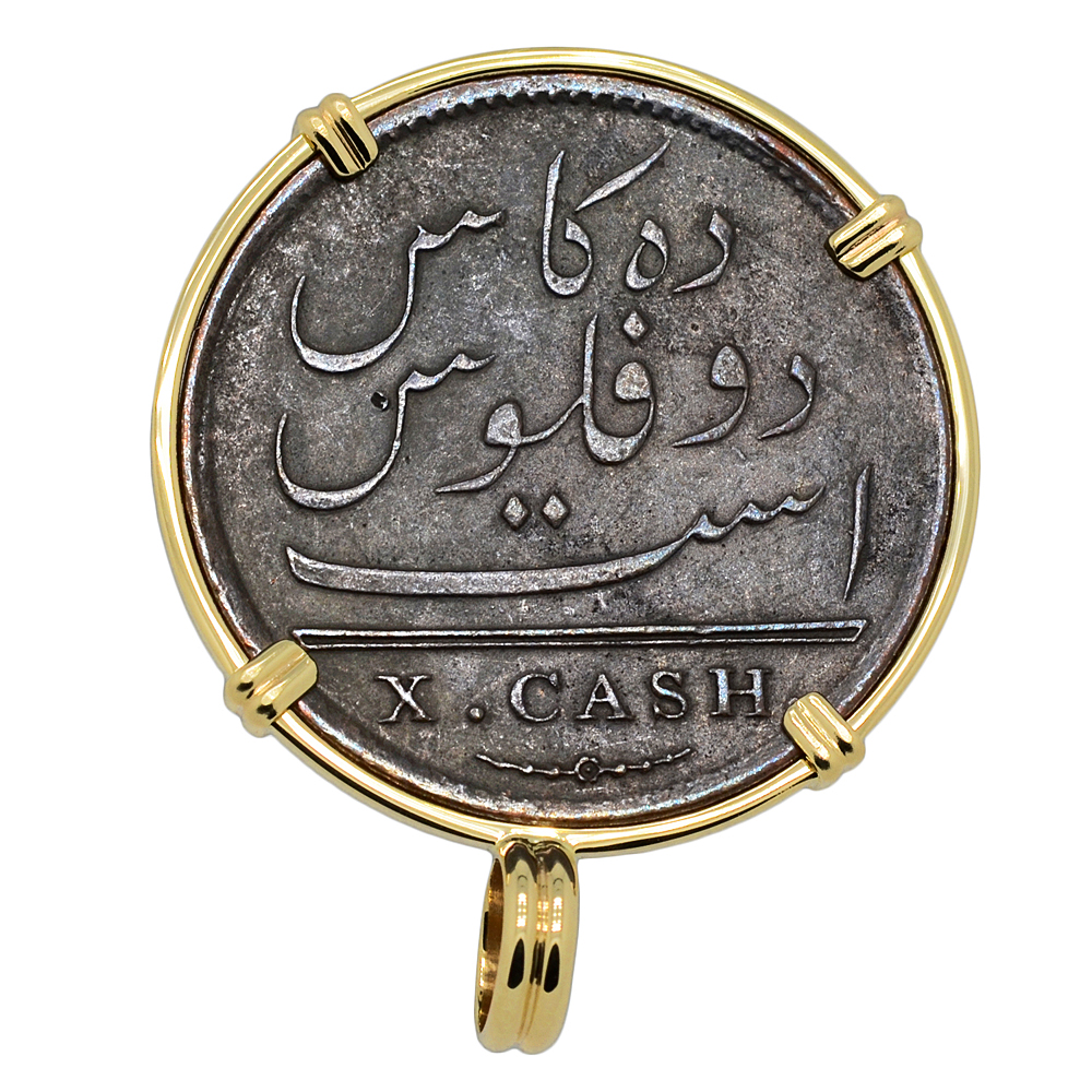 The obverse side of this shipwreck coin shows the coat of arms of the British East India Company with the 1808 date below. The reverse side bears a Mughal inscription and an "X" denoting the denomination of ten cash.
