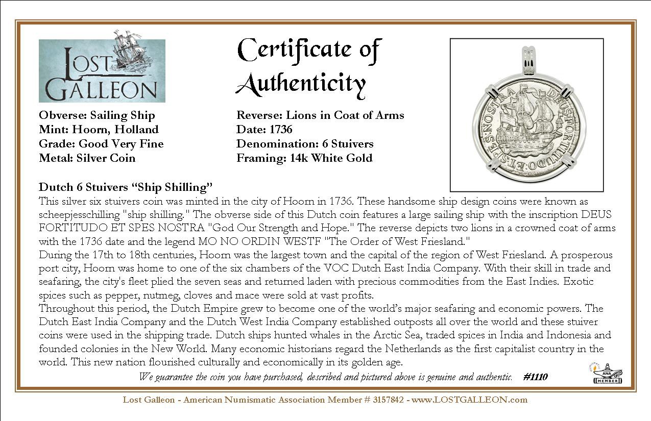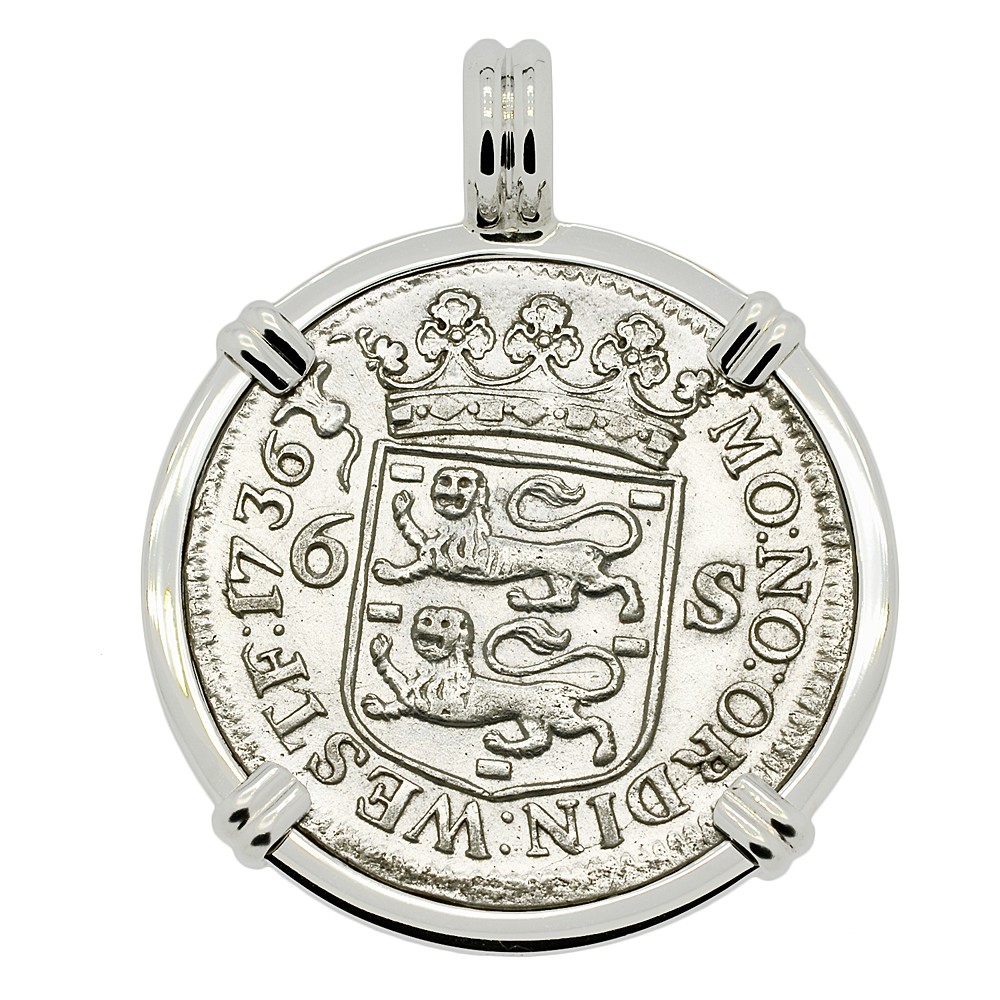 This silver six stuivers coin was minted in the city of Hoorn in 1736. These handsome ship design coins were known as scheepjesschilling "ship shilling." The obverse side of this Dutch coin features a large sailing ship with the inscription DEUS FORTITUDO ET SPES NOSTRA "God Our Strength and Hope." The reverse depicts two lions in a crowned coat of arms with the 1736 date and the legend MO NO ORDIN WESTF "The Order of West Friesland."