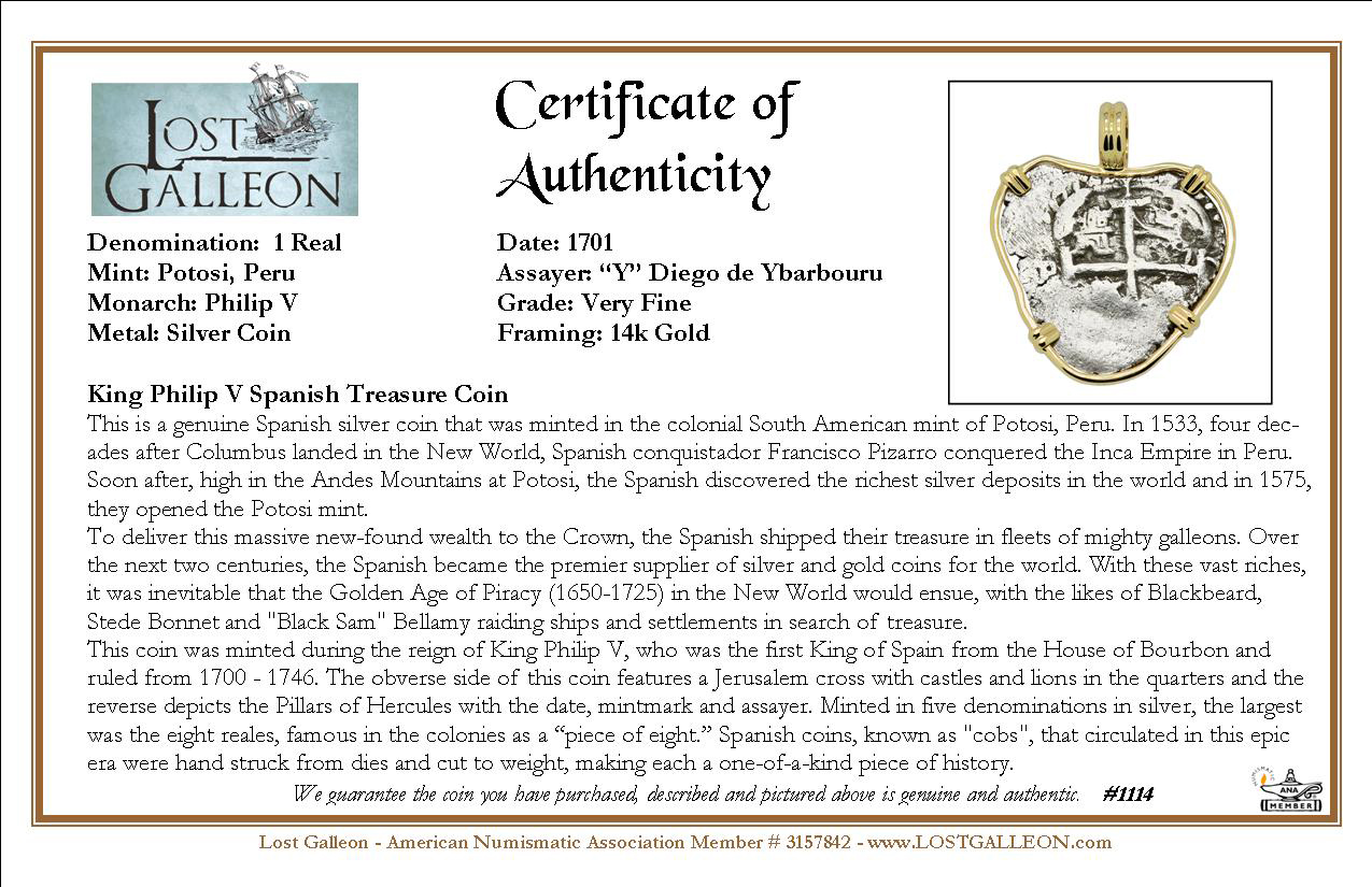 This coin was minted during the reign of King Philip V, who was the first King of Spain from the House of Bourbon and ruled from 1700 - 1746. The obverse side of this coin features a Jerusalem cross with castles and lions in the quarters and the reverse depicts the Pillars of Hercules with the date, mintmark and assayer. Minted in five denominations in silver, the largest was the eight reales, famous in the colonies as a “piece of eight.” Spanish coins, known as "cobs", that circulated in this epic era were hand struck from dies and cut to weight, making each a one-of-a-kind piece of history.