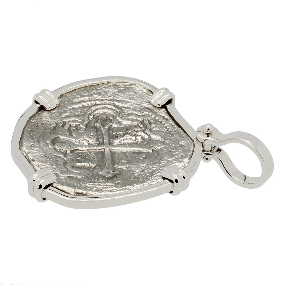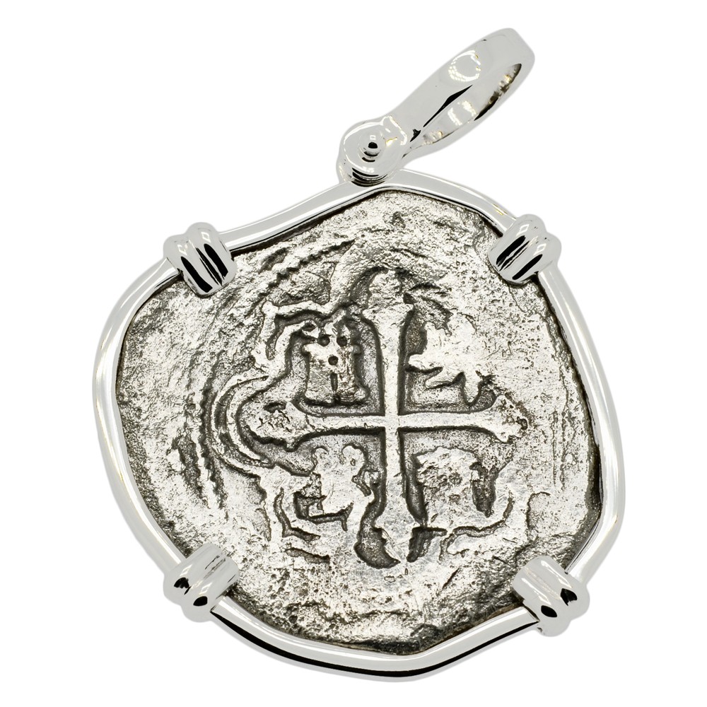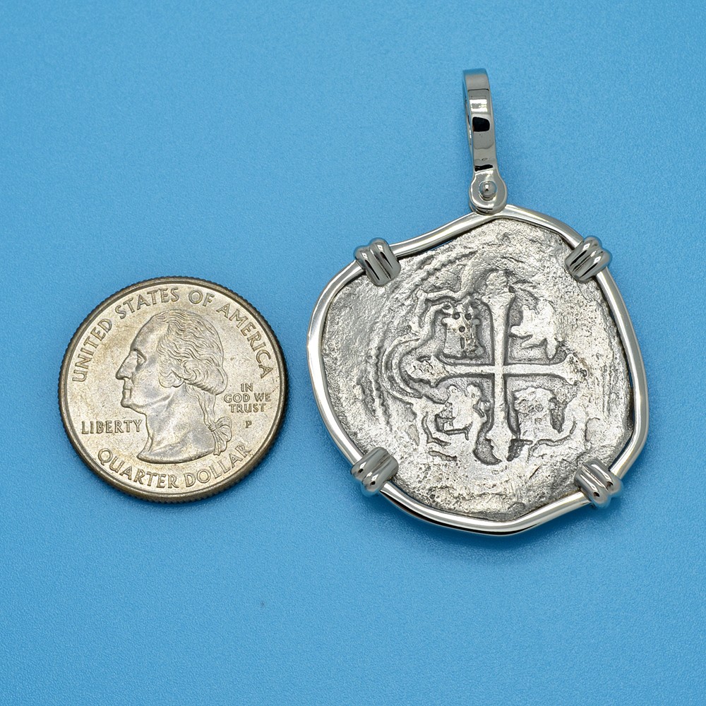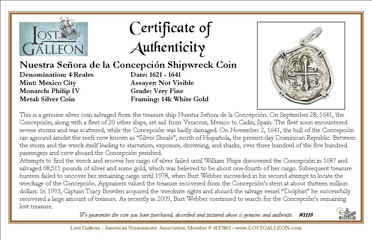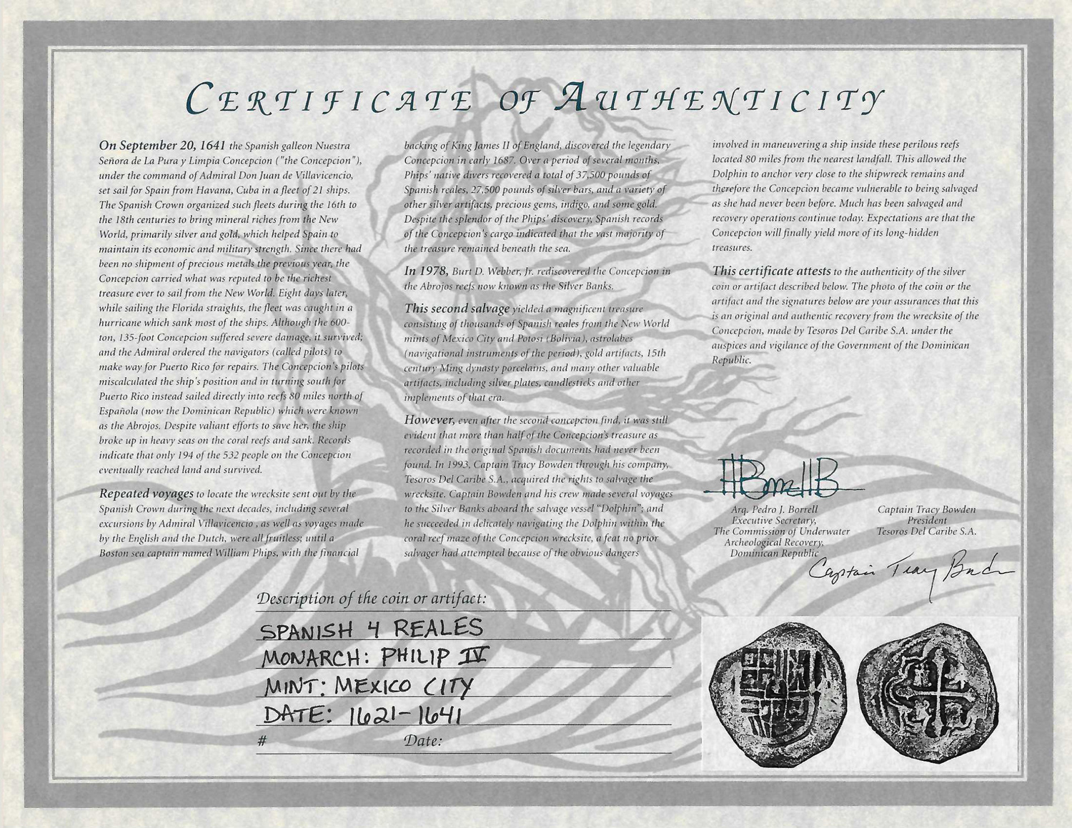 Salvagers certificate included. This is a genuine silver coin salvaged from the treasure ship Nuestra Señora de la Concepción. On September 28, 1641, the Concepción, along with a fleet of 20 other ships, set sail from Veracruz, Mexico to Cadiz, Spain. The fleet soon encountered severe storms and was scattered, while the Concepción was badly damaged. On November 2, 1641, the hull of the Concepción ran aground amidst the reefs now known as “Silver Shoals”, north of Hispañola, the present-day Dominican Republic. Between the storm and the wreck itself leading to starvation, exposure, drowning, and sharks, over three hundred of the five hundred passengers and crew aboard the Concepción perished.