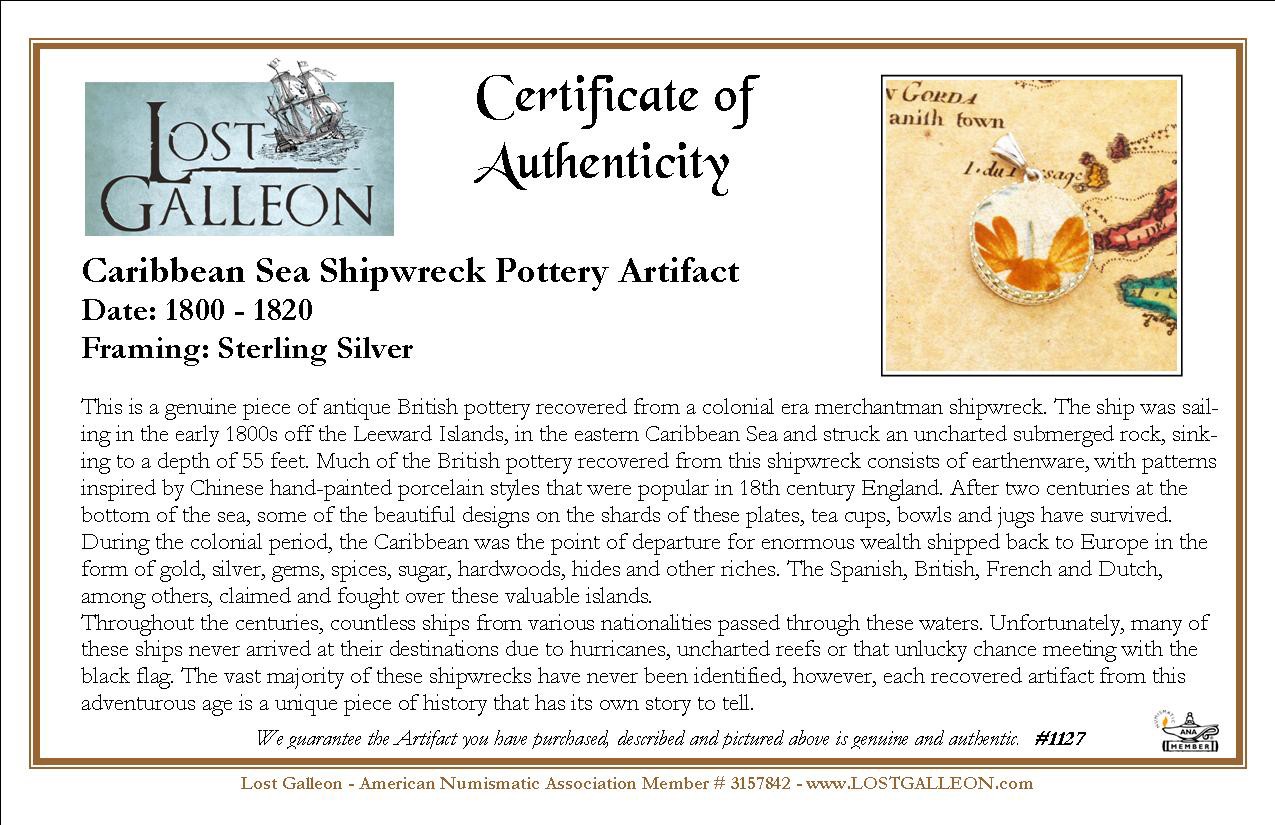 This is a genuine piece of antique British pottery recovered from a colonial era merchantman shipwreck. The ship was sailing in the early 1800s off the Leeward Islands, in the eastern Caribbean Sea and struck an uncharted submerged rock, sinking to a depth of 55 feet. Much of the British pottery recovered from this shipwreck consists of earthenware, with patterns inspired by Chinese hand-painted porcelain styles that were popular in 18th century England. After two centuries at the bottom of the sea, some of the beautiful designs on the shards of these plates, tea cups, bowls and jugs have survived.