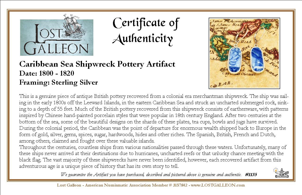 This is a genuine piece of antique British pottery recovered from a colonial era merchantman shipwreck. The ship was sailing in the early 1800s off the Leeward Islands, in the eastern Caribbean Sea and struck an uncharted submerged rock, sinking to a depth of 55 feet. Much of the British pottery recovered from this shipwreck consists of earthenware, with patterns inspired by Chinese hand-painted porcelain styles that were popular in 18th century England. After two centuries at the bottom of the sea, some of the beautiful designs on the shards of these plates, tea cups, bowls and jugs have survived.