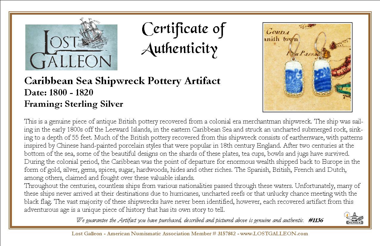 This is a genuine piece of antique British pottery recovered from a colonial era merchantman shipwreck. The ship was sailing in the early 1800s off the Leeward Islands, in the eastern Caribbean Sea and struck an uncharted submerged rock, sinking to a depth of 55 feet. Much of the British pottery recovered from this shipwreck consists of earthenware, with patterns inspired by Chinese hand-painted porcelain styles that were popular in 18th century England. After two centuries at the bottom of the sea, some of the beautiful designs on the shards of these plates, tea cups, bowls and jugs have survived.