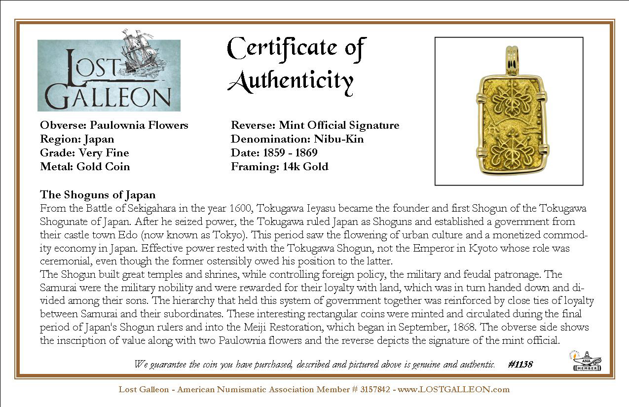 The Shogun built great temples and shrines, while controlling foreign policy, the military and feudal patronage. The Samurai were the military nobility and were rewarded for their loyalty with land, which was in turn handed down and divided among their sons. The hierarchy that held this system of government together was reinforced by close ties of loyalty between Samurai and their subordinates. These interesting rectangular coins were minted and circulated during the final period of Japan's Shogun rulers and into the Meiji Restoration, which began in September, 1868. The obverse side shows the inscription of value along with two Paulownia flowers and the reverse depicts the signature of the mint official.