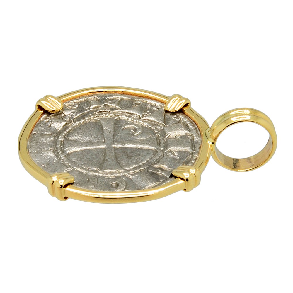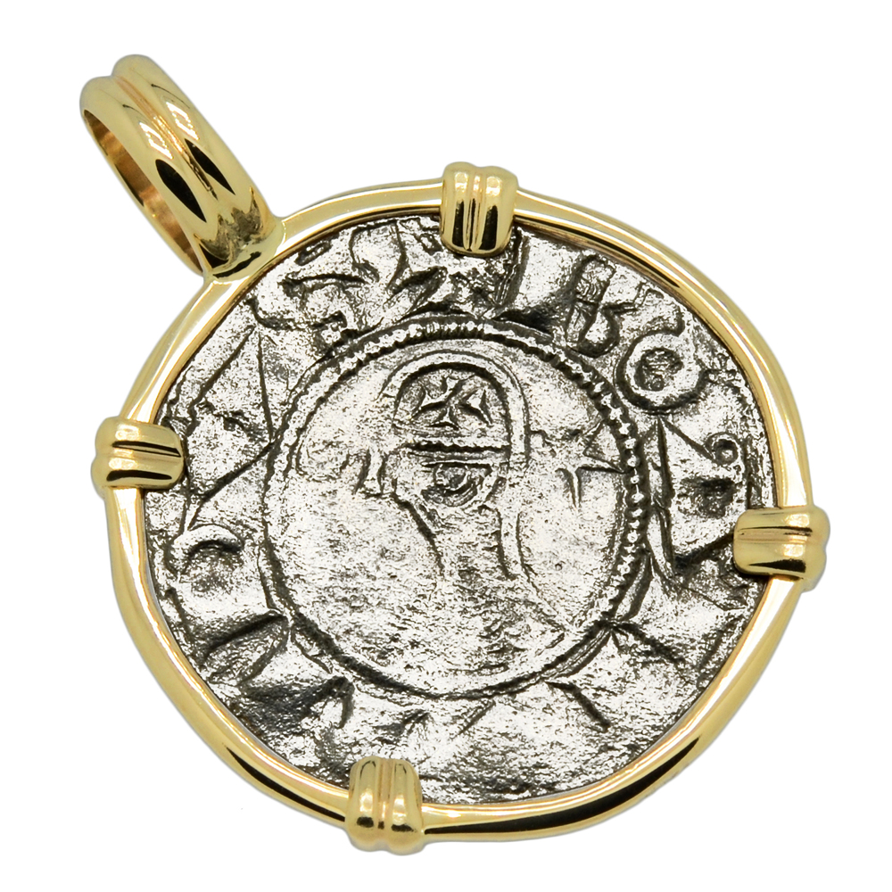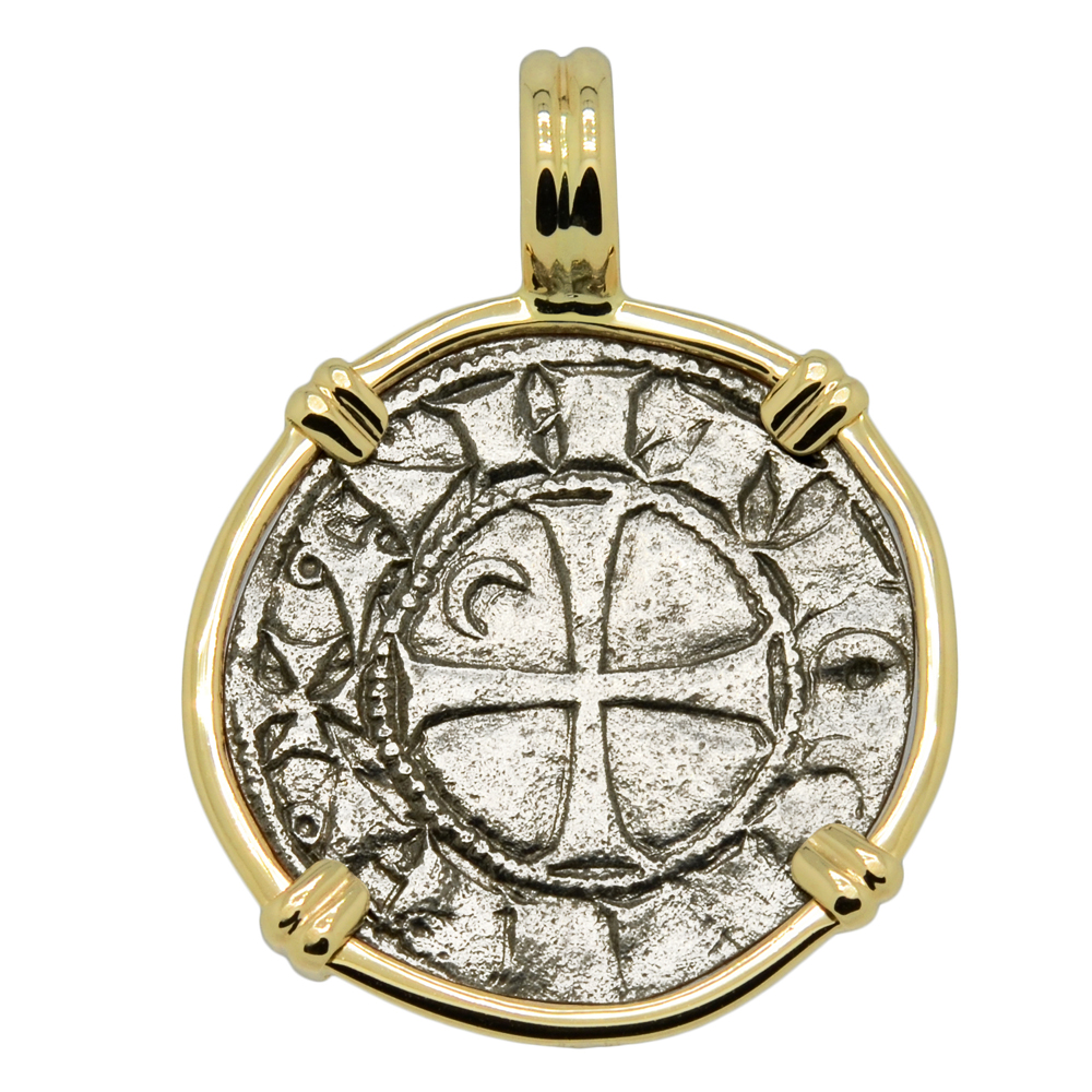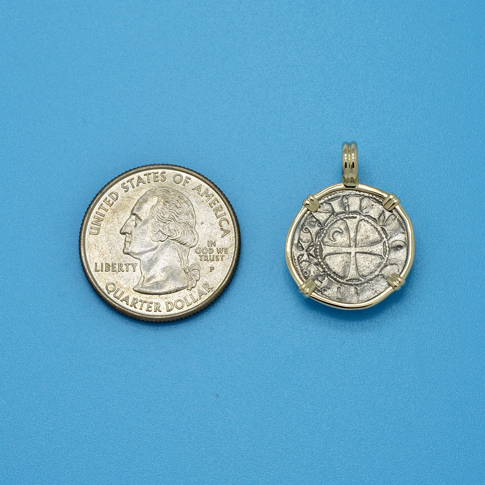 • Silver Denier Coin in 14k Gold Pendant, Weight 2g