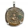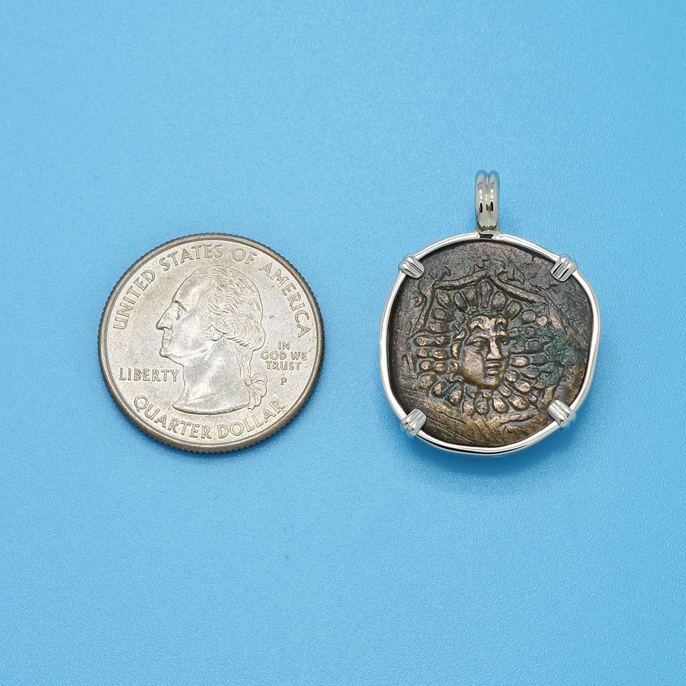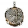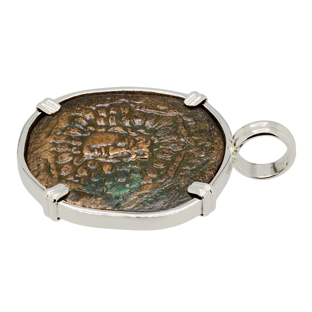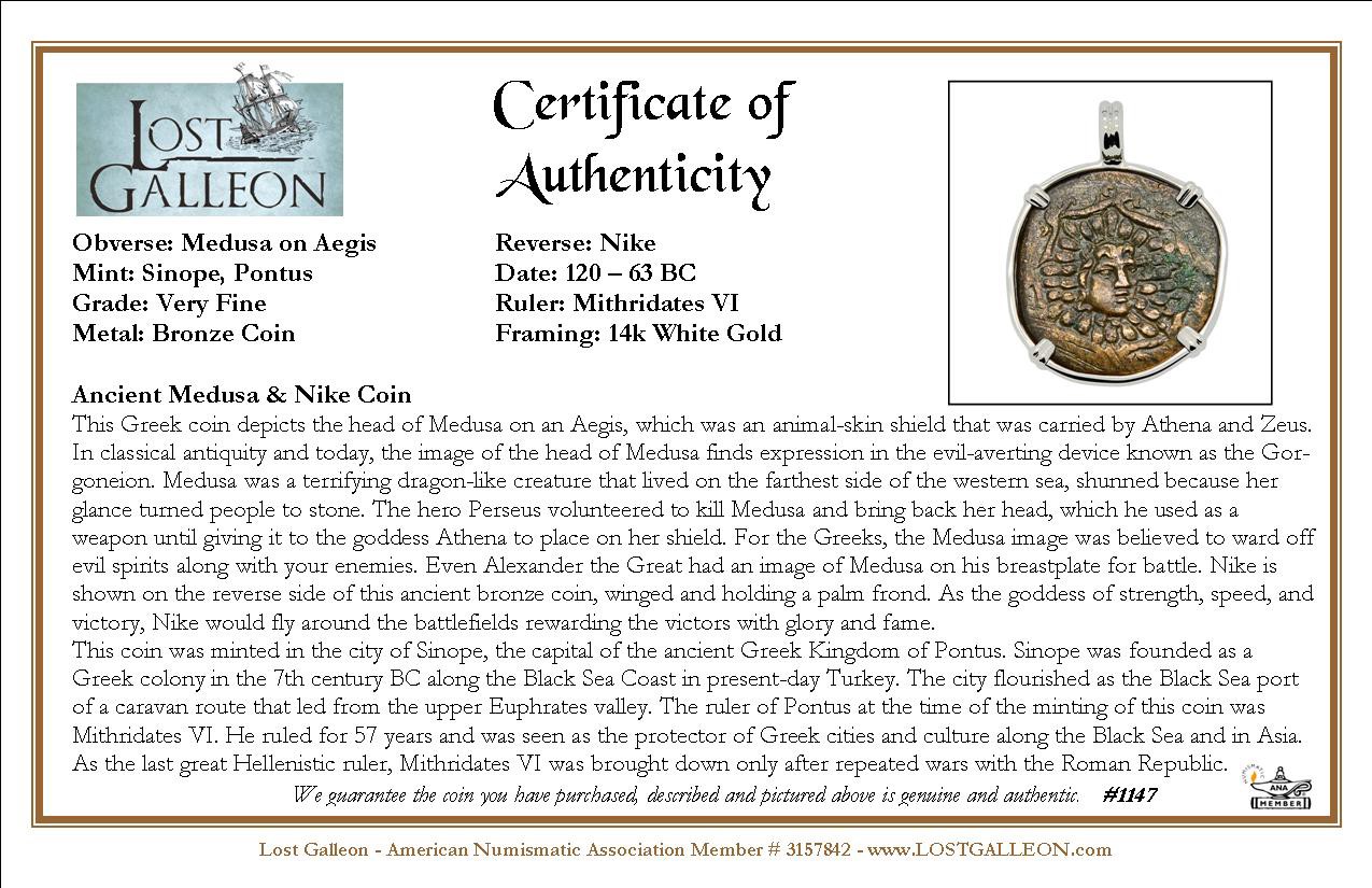 For the Greeks, the Medusa image was believed to ward off evil spirits along with your enemies. Even Alexander the Great had an image of Medusa on his breastplate for battle. Nike is shown on the reverse side of this ancient bronze coin, winged and holding a palm frond. As the goddess of strength, speed, and victory, Nike would fly around the battlefields rewarding the victors with glory and fame.