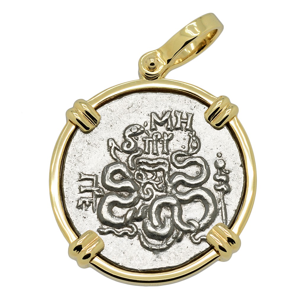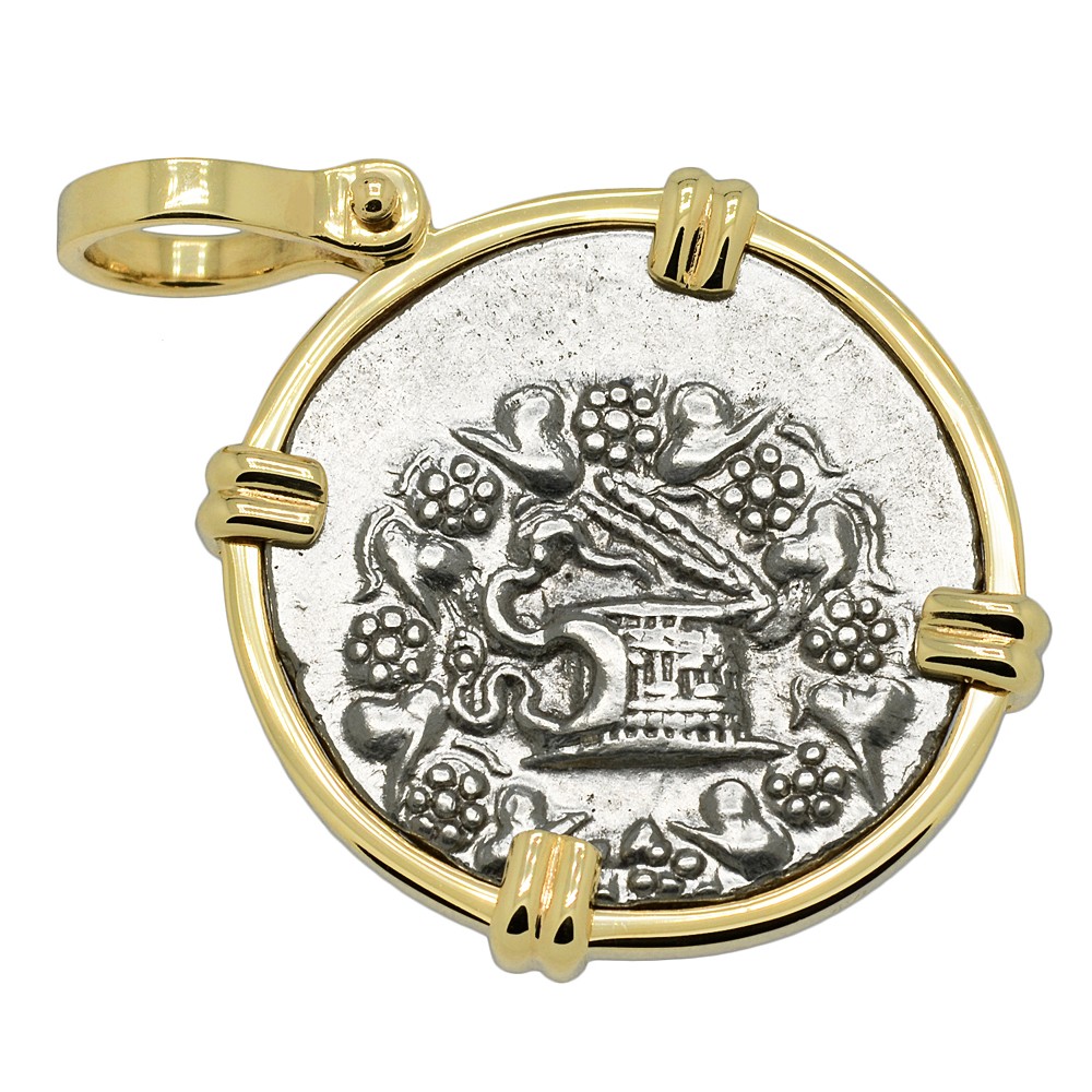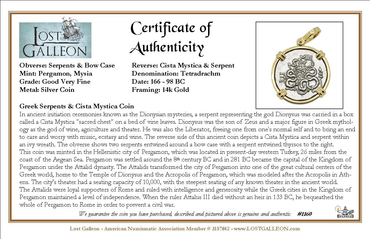 In ancient initiation ceremonies known as the Dionysian mysteries, a serpent representing the god Dionysus was carried in a box called a Cista Mystica "sacred chest" on a bed of vine leaves. Dionysus was the son of Zeus and a major figure in Greek mythology as the god of wine, agriculture and theater. He was also the Liberator, freeing one from one's normal self and to bring an end to care and worry with music, ecstasy and wine. The reverse side of this ancient coin depicts a Cista Mystica and serpent within an ivy wreath. The obverse shows two serpents entwined around a bow case with a serpent entwined thyrsos to the right.
