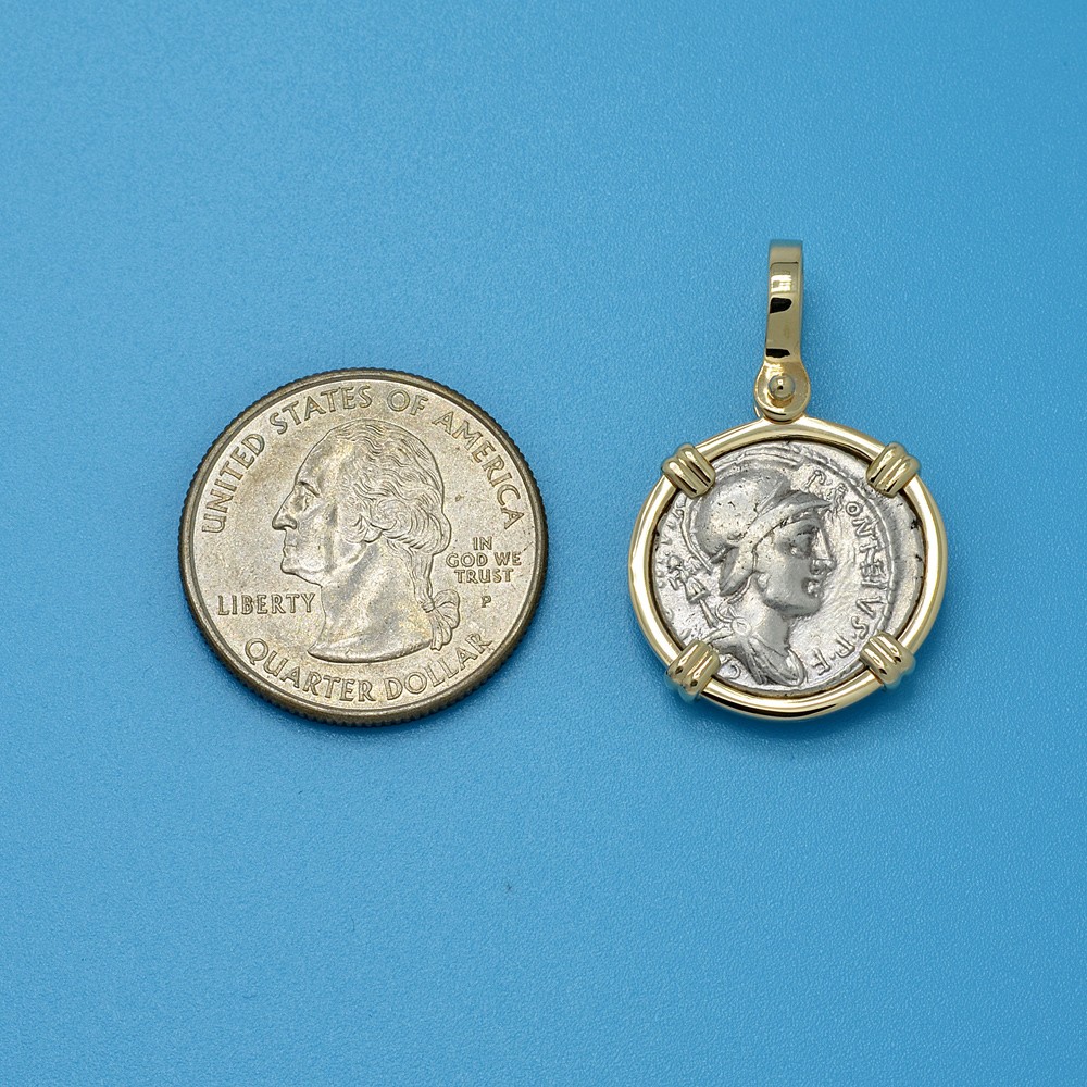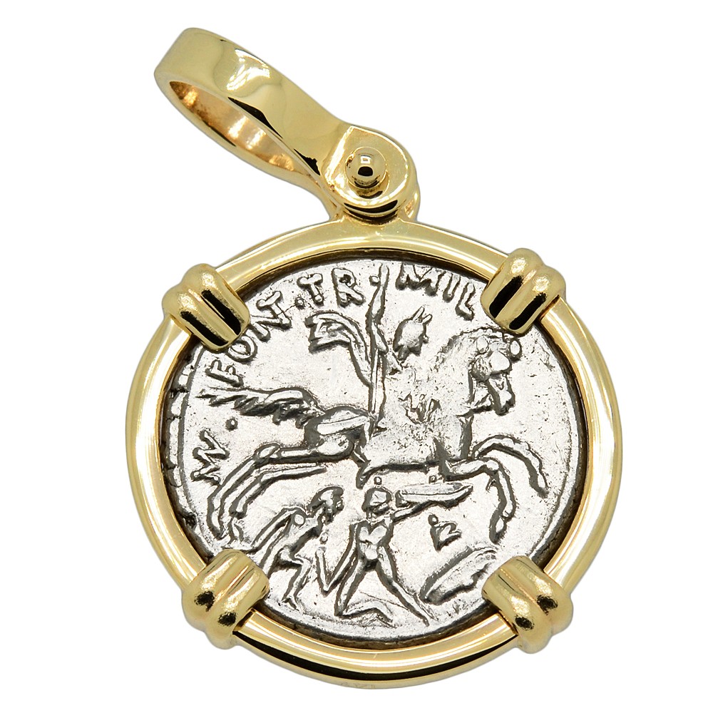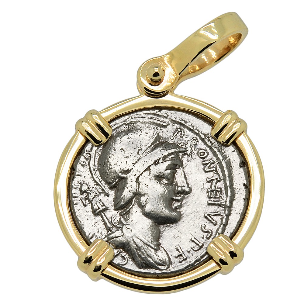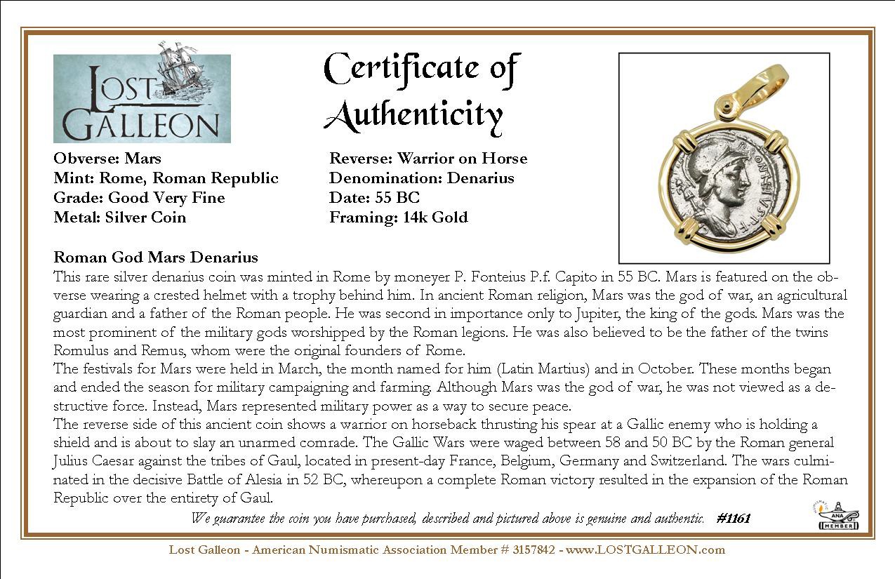 This rare silver denarius coin was minted in Rome by moneyer P. Fonteius P.f. Capito in 55 BC. Mars is featured on the obverse wearing a crested helmet with a trophy behind him. In ancient Roman religion, Mars was the god of war, an agricultural guardian and a father of the Roman people. He was second in importance only to Jupiter, the king of the gods. Mars was the most prominent of the military gods worshipped by the Roman legions. He was also believed to be the father of the twins Romulus and Remus, whom were the original founders of Rome.