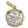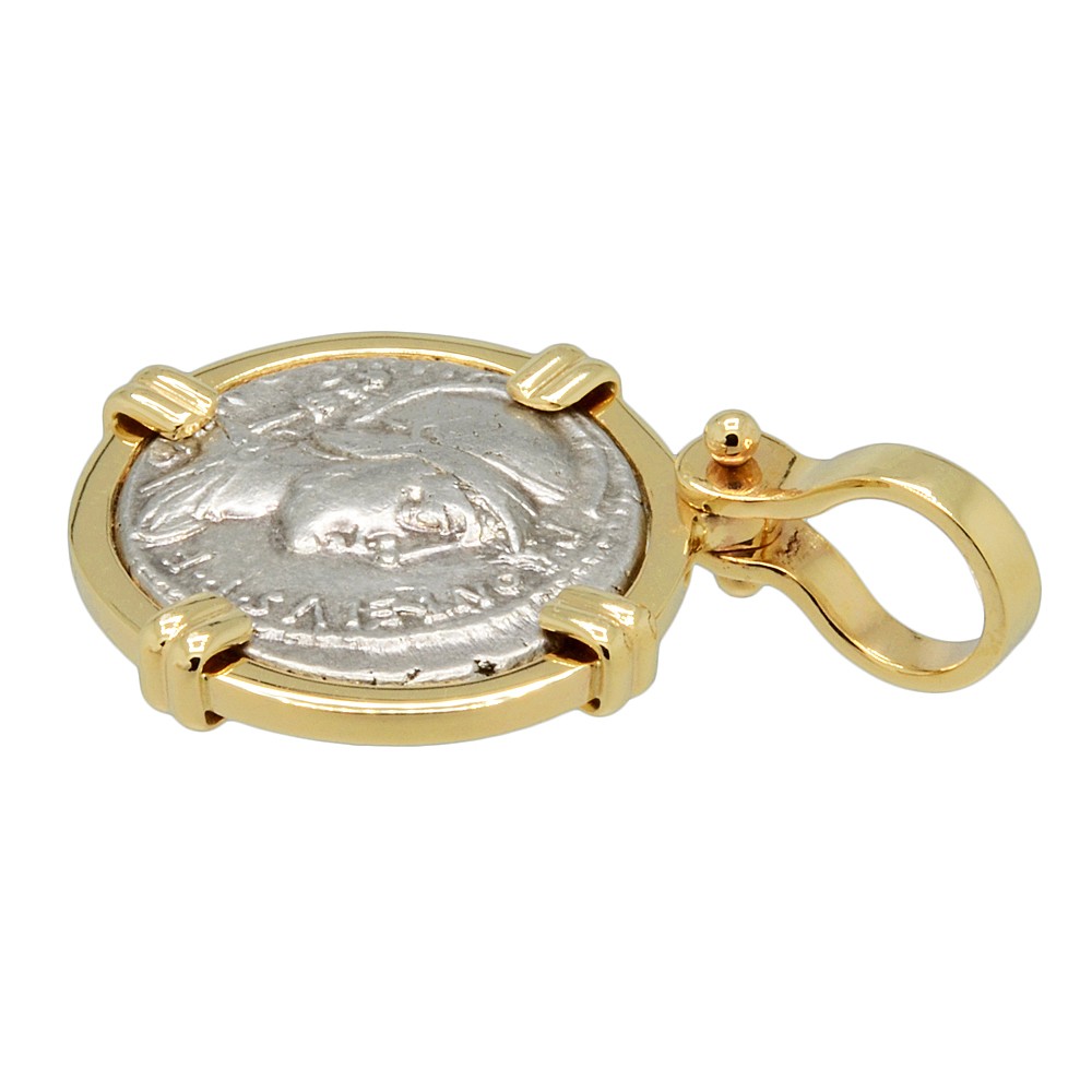The reverse side of this ancient coin shows a warrior on horseback thrusting his spear at a Gallic enemy who is holding a shield and is about to slay an unarmed comrade. The Gallic Wars were waged between 58 and 50 BC by the Roman general Julius Caesar against the tribes of Gaul, located in present-day France, Belgium, Germany and Switzerland. The wars culminated in the decisive Battle of Alesia in 52 BC, whereupon a complete Roman victory resulted in the expansion of the Roman Republic over the entirety of Gaul.