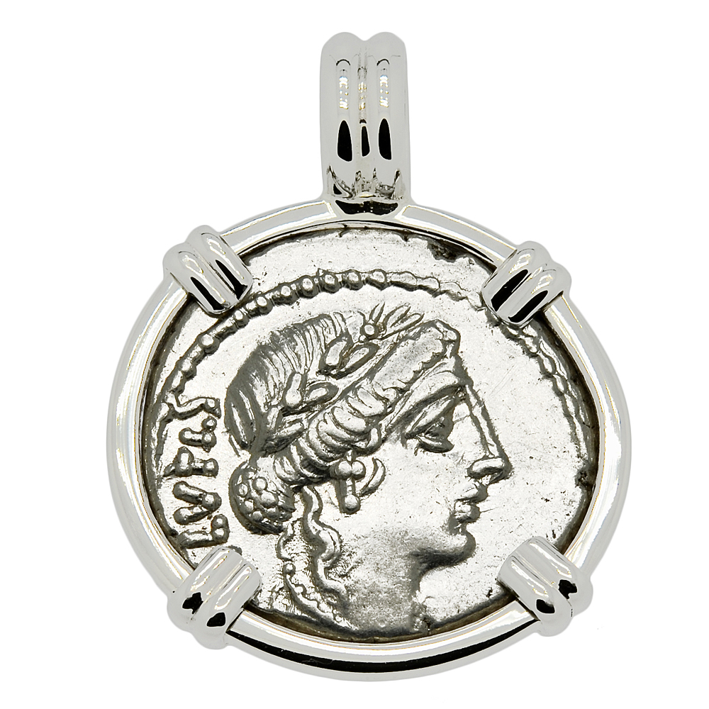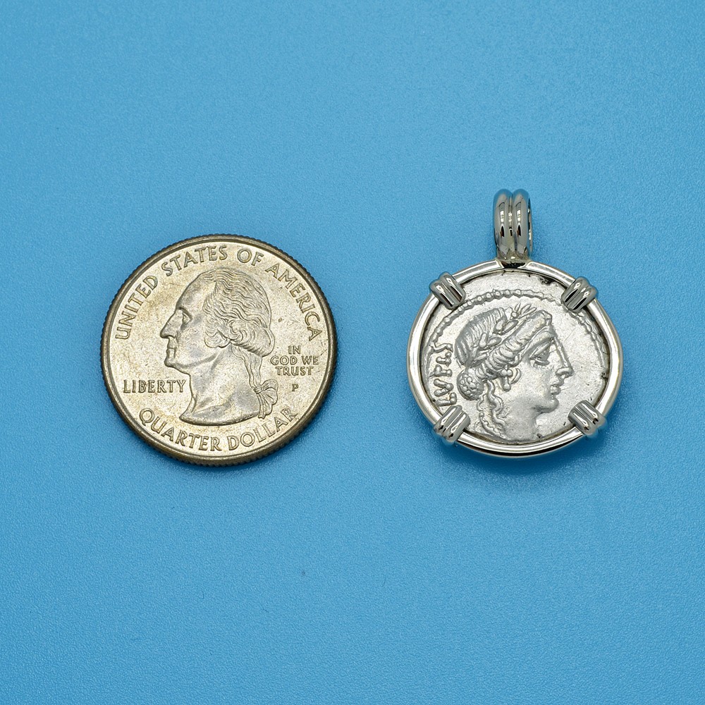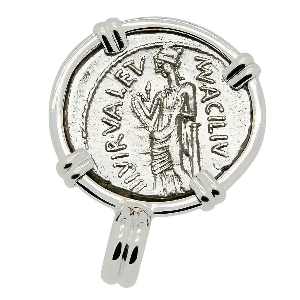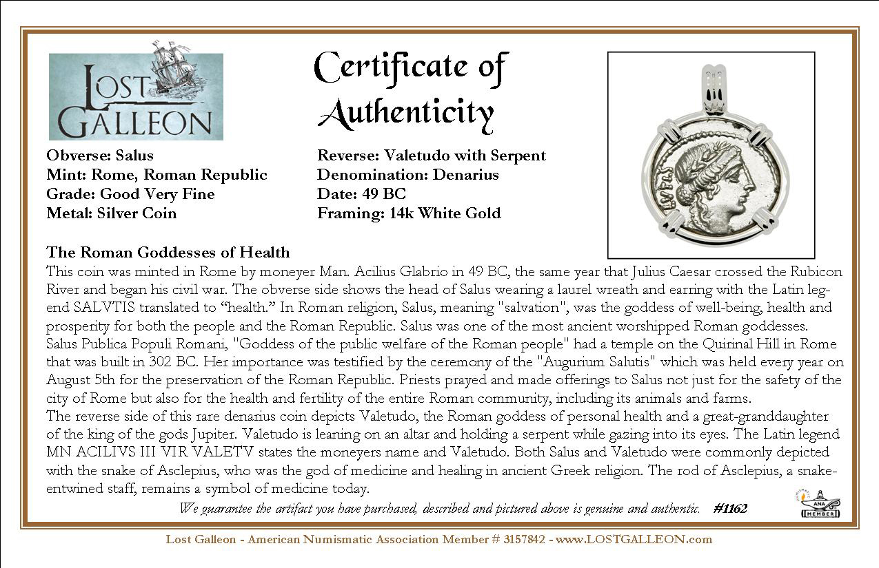 This coin was minted in Rome by moneyer Man. Acilius Glabrio in 49 BC, the same year that Julius Caesar crossed the Rubicon River and began his civil war. The obverse side shows the head of Salus wearing a laurel wreath and earring with the Latin legend SALVTIS translated to “health.” In Roman religion, Salus, meaning "salvation", was the goddess of well-being, health and prosperity for both the people and the Roman Republic.