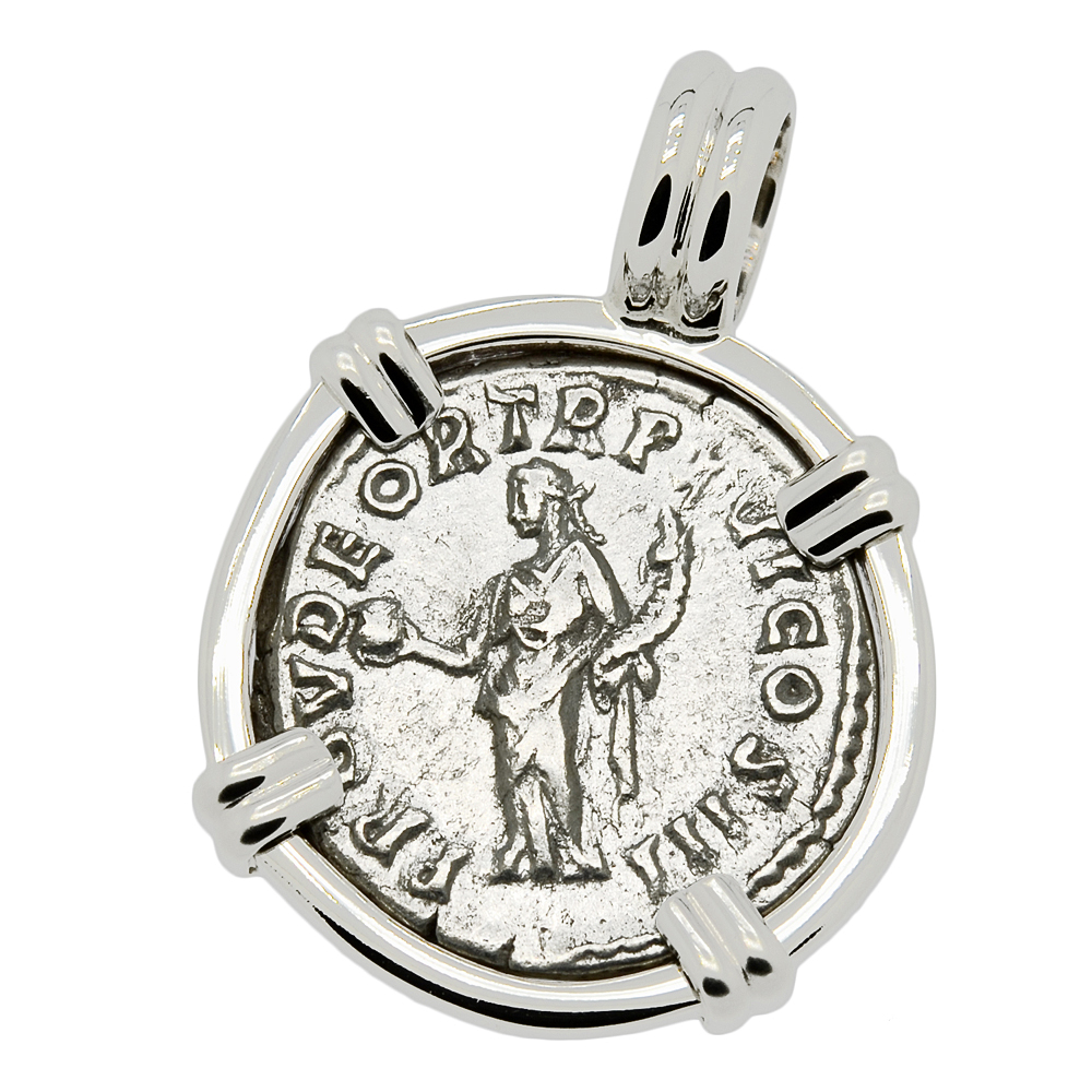 The reverse side of this denarius coin depicts the goddess Providentia standing while holding a globe and a cornucopia. In ancient Roman religion, Providentia was the divine personification of the ability to foresee and make provision.