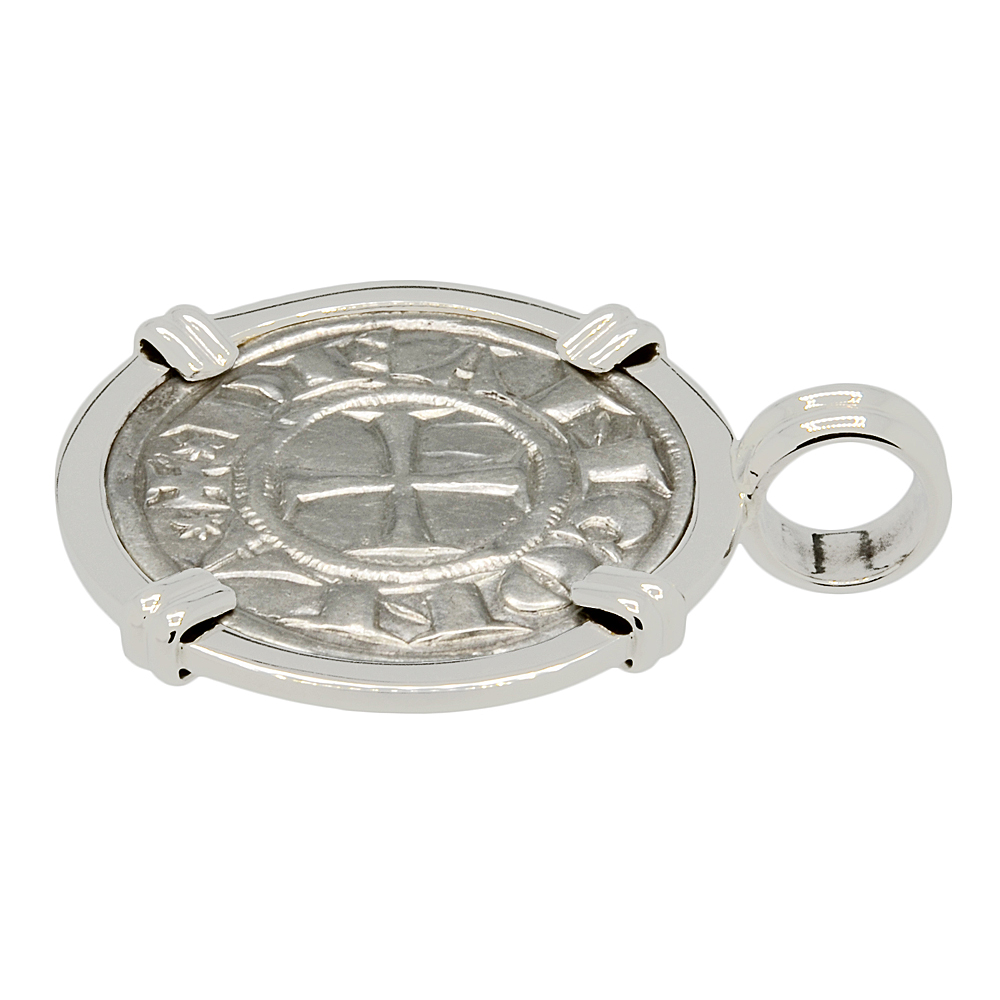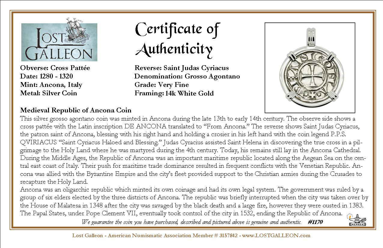 This silver grosso agontano coin was minted in Ancona during the late 13th to early 14th century. The observe side shows a cross pattée with the Latin inscription DE ANCONA translated to “From Ancona.” The reverse shows Saint Judas Cyriacus, the patron saint of Ancona, blessing with his right hand and holding a crosier in his left hand with the coin legend P.P.S. QVIRIACUS “Saint Cyriacus Haloed and Blessing.” Judas Cyracius assisted Saint Helena in discovering the true cross in a pilgrimage to the Holy Land where he was martyred during the 4th century. Today, his remains still lay in the Ancona Cathedral.