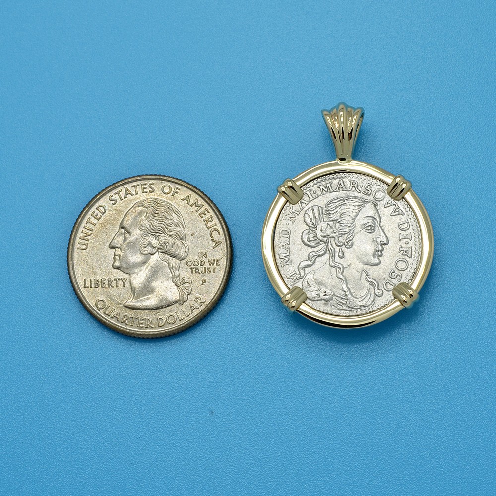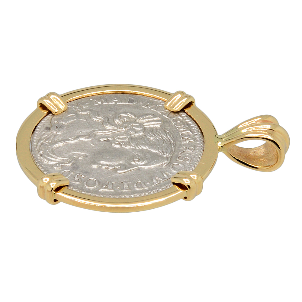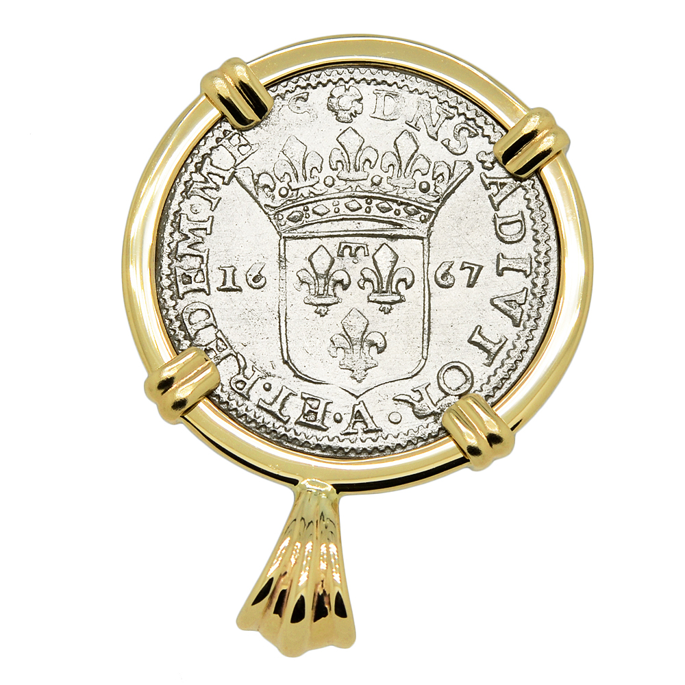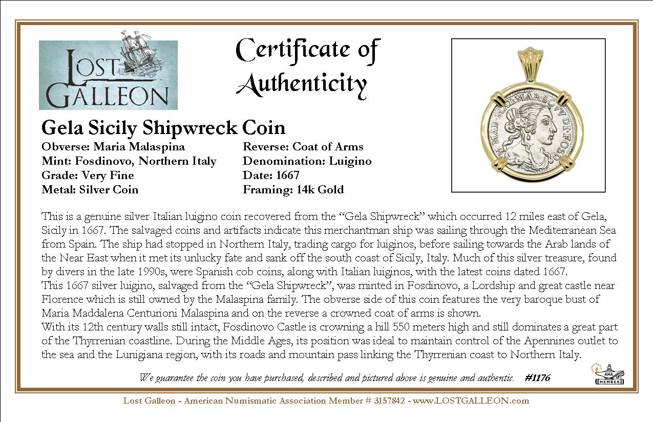 This is a genuine silver Italian luigino coin recovered from the “Gela Shipwreck” which occurred 12 miles east of Gela, Sicily in 1667. The salvaged coins and artifacts indicate this merchantman ship was sailing through the Mediterranean Sea from Spain. The ship had stopped in Northern Italy, trading cargo for luiginos, before sailing towards the Arab lands of the Near East when it met its unlucky fate and sank off the south coast of Sicily, Italy. Much of this silver treasure, found by divers in the late 1990s, were Spanish cob coins, along with Italian luiginos, with the latest coins dated 1667.