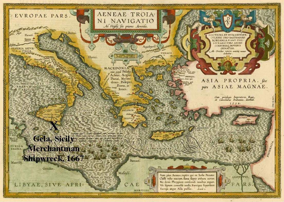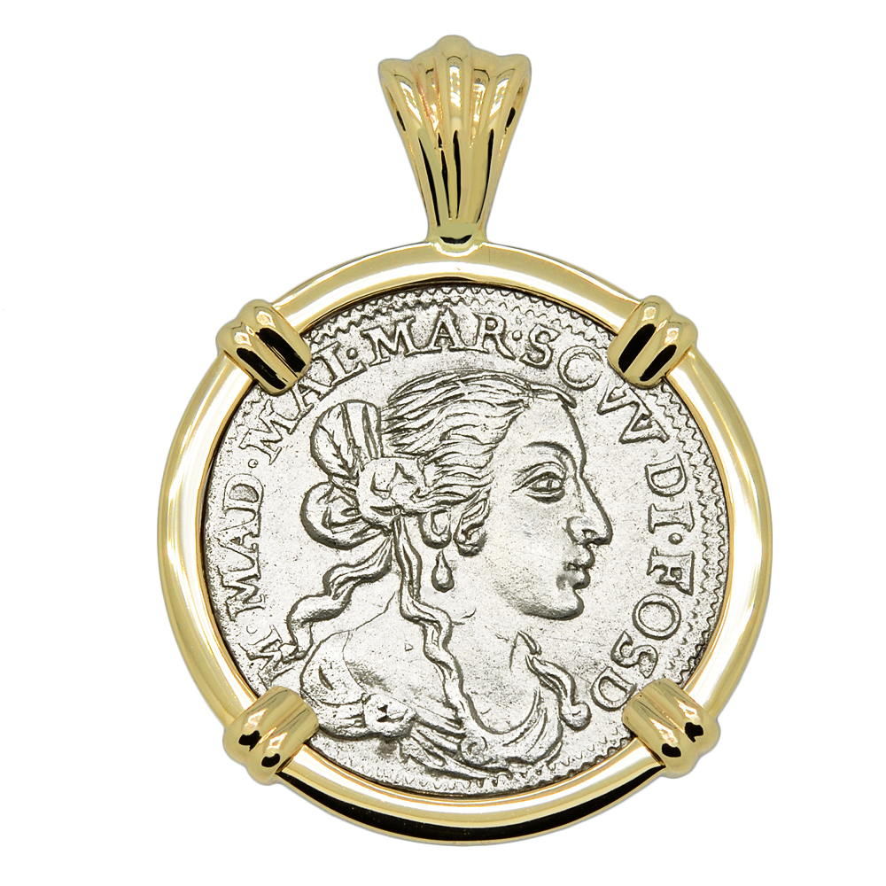 This 1667 silver luigino, salvaged from the “Gela Shipwreck”, was minted in Fosdinovo, a Lordship and great castle near Florence which is still owned by the Malaspina family. The obverse side of this coin features the very baroque bust of Maria Maddalena Centurioni Malaspina and on the reverse a crowned coat of arms is shown.