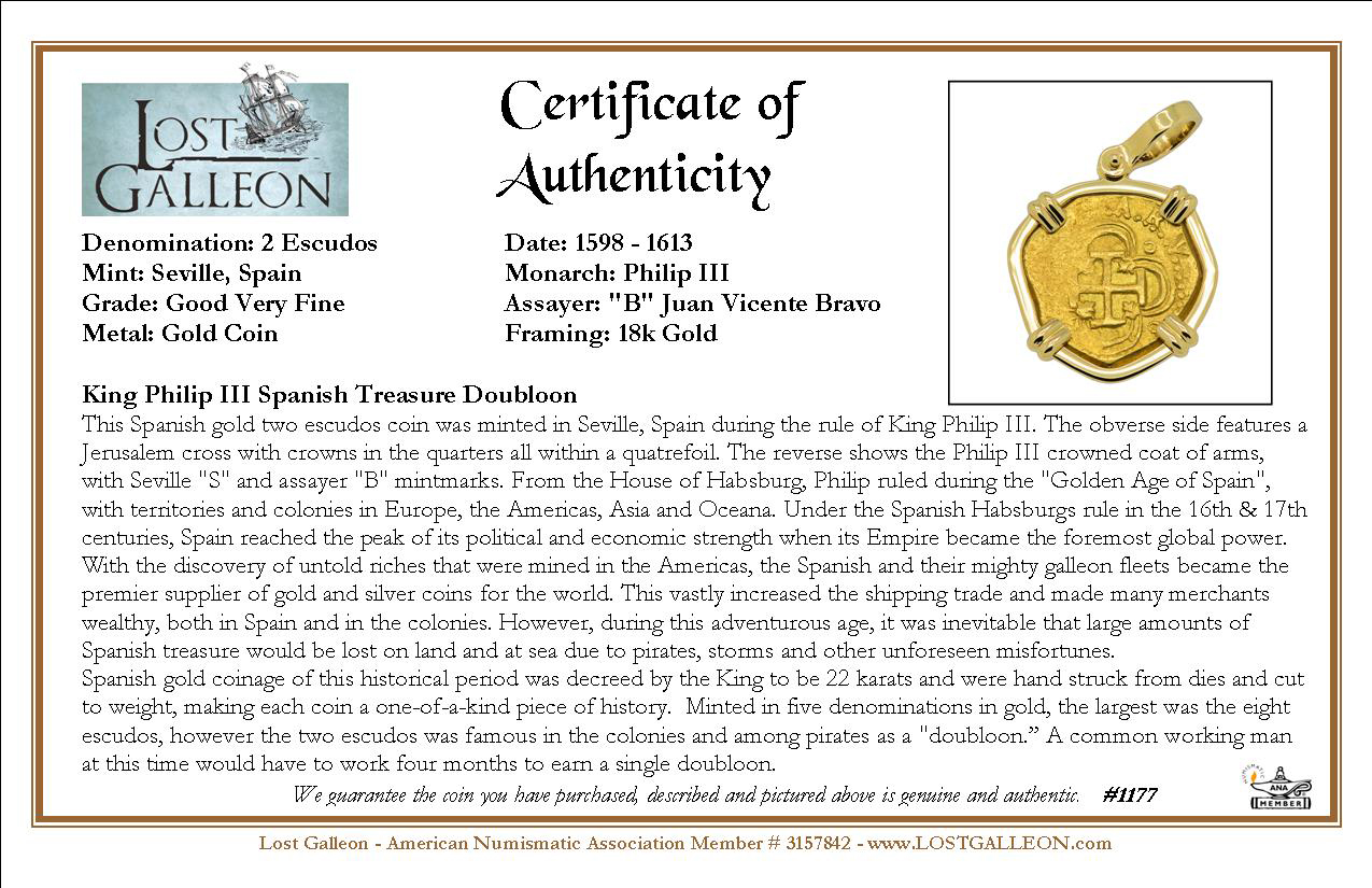This Spanish gold two escudos coin was minted in Seville, Spain during the rule of King Philip III. The obverse side features a Jerusalem cross with crowns in the quarters all within a quatrefoil. The reverse shows the Philip III crowned coat of arms, with Seville "S" and assayer "B" mintmarks. From the House of Habsburg, Philip ruled during the "Golden Age of Spain", with territories and colonies in Europe, the Americas, Asia and Oceana. Under the Spanish Habsburgs rule in the 16th & 17th centuries, Spain reached the peak of its political and economic strength when its Empire became the foremost global power.