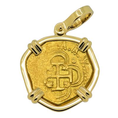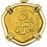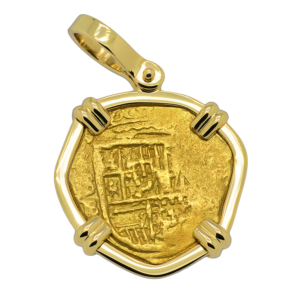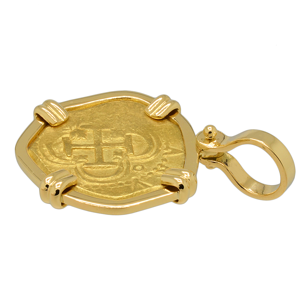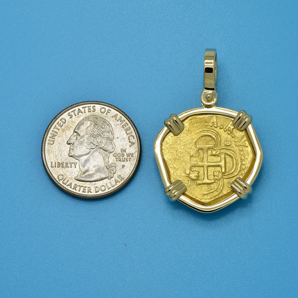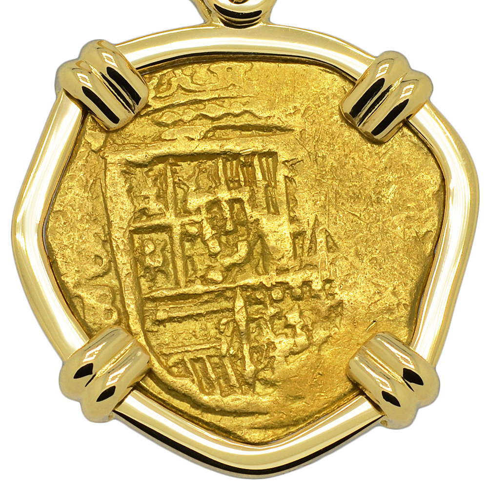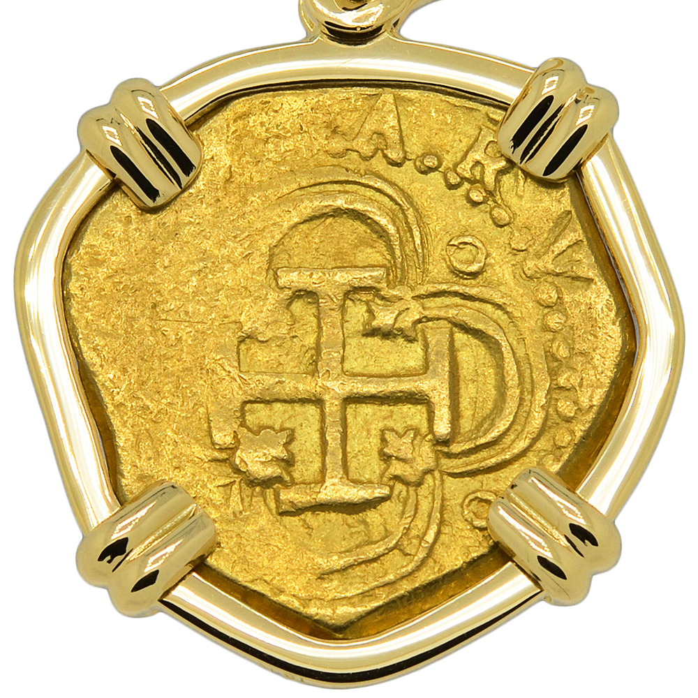 Spanish gold coinage of this historical period was decreed by the King to be 22 karats and were hand struck from dies and cut to weight, making each coin a one-of-a-kind piece of history. Minted in five denominations in gold, the largest was the eight escudos, however the two escudos was famous in the colonies and among pirates as a "doubloon.” A common working man at this time would have to work four months to earn a single doubloon.