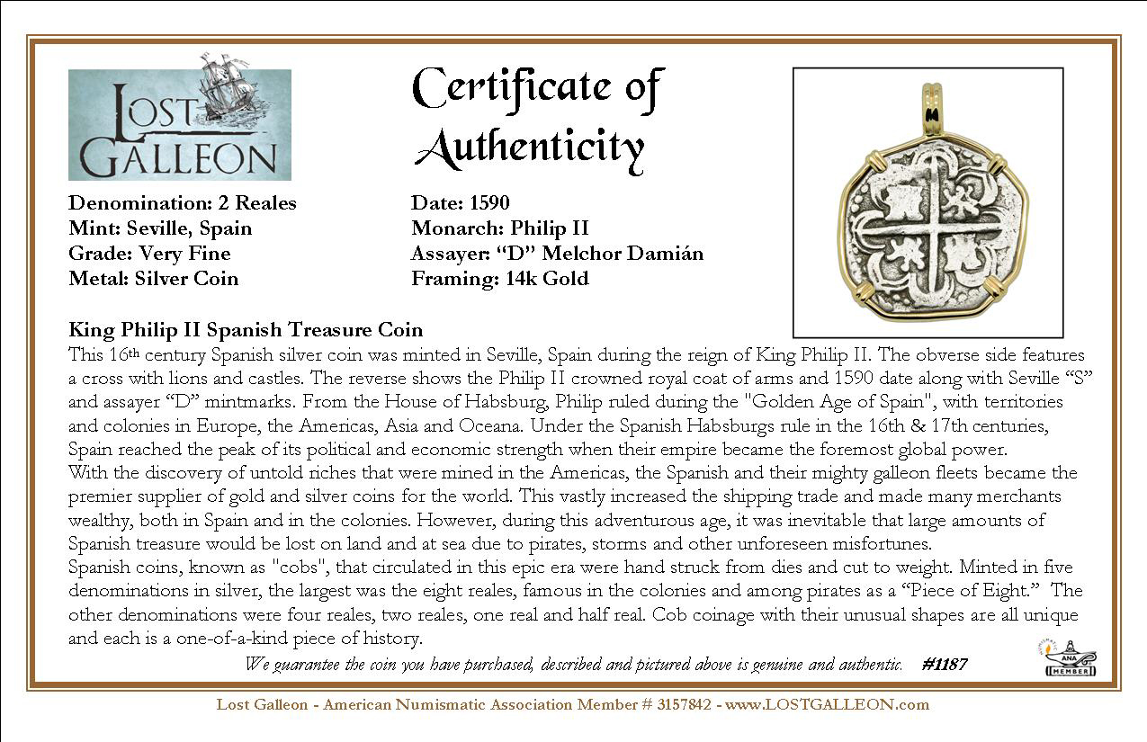 This 16th century Spanish silver coin was minted in Seville, Spain during the reign of King Philip II. The obverse side features a cross with lions and castles. The reverse shows the Philip II crowned royal coat of arms and 1590 date along with Seville “S” and assayer “D” mintmarks. From the House of Habsburg, Philip ruled during the "Golden Age of Spain", with territories and colonies in Europe, the Americas, Asia and Oceana. Under the Spanish Habsburgs rule in the 16th & 17th centuries, Spain reached the peak of its political and economic strength when their empire became the foremost global power.