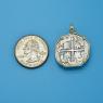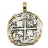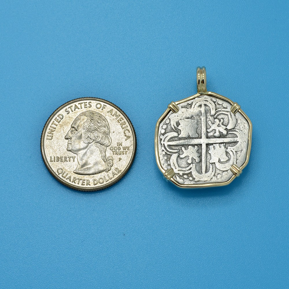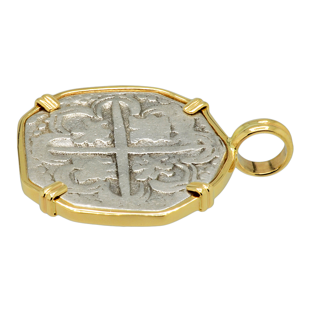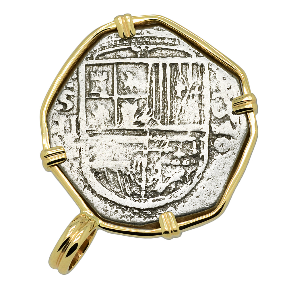 Spanish coins, known as "cobs", that circulated in this epic era were hand struck from dies and cut to weight. Minted in five denominations in silver, the largest was the eight reales, famous in the colonies and among pirates as a “Piece of Eight.” The other denominations were four reales, two reales, one real and half real. Cob coinage with their unusual shapes are all unique and each is a one-of-a-kind piece of history.