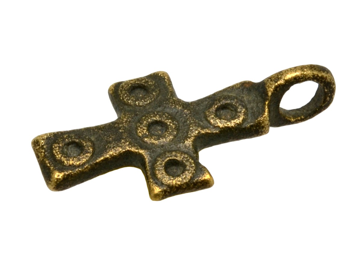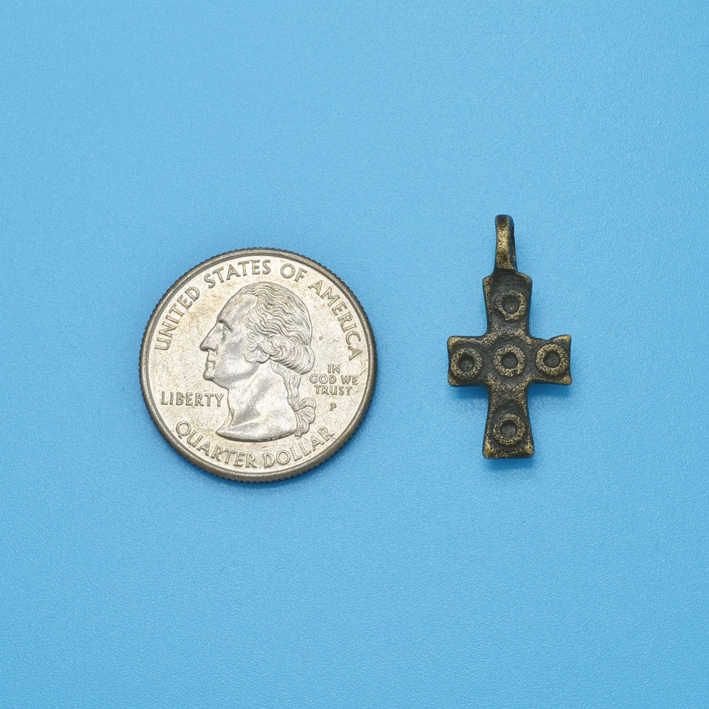 This bronze cross was hand forged during the Middle Ages in the cradle of Christianity, the Byzantine Empire. The front side of this cross is decorated with five punched-dots, which represented the "Five Wounds of Christ."