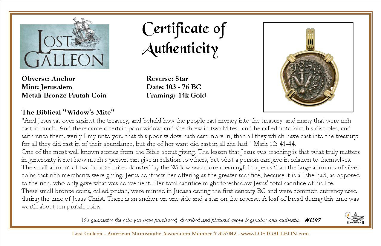 These small bronze coins, called prutah, were minted in Judaea during the first century BC and were common currency used during the time of Christ. There is an anchor on one side and a star on the reverse. A loaf of bread during this time was worth about ten prutah coins.