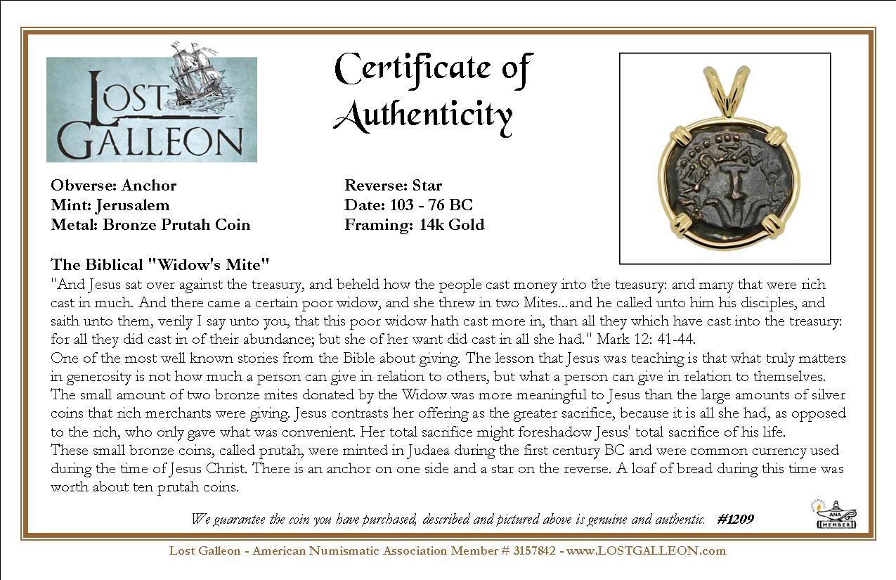 These small bronze coins, called prutah, were minted in Judaea during the first century BC and were common currency used during the time of Christ. There is an anchor on one side and a star on the reverse. A loaf of bread during this time was worth about ten prutah coins.