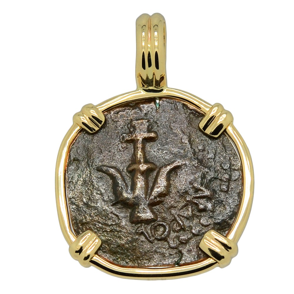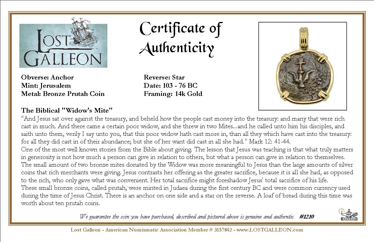 These small bronze coins, called prutah, were minted in Judaea during the first century BC and were common currency used during the time of Christ. There is an anchor on one side and a star on the reverse. A loaf of bread during this time was worth about ten prutah coins.