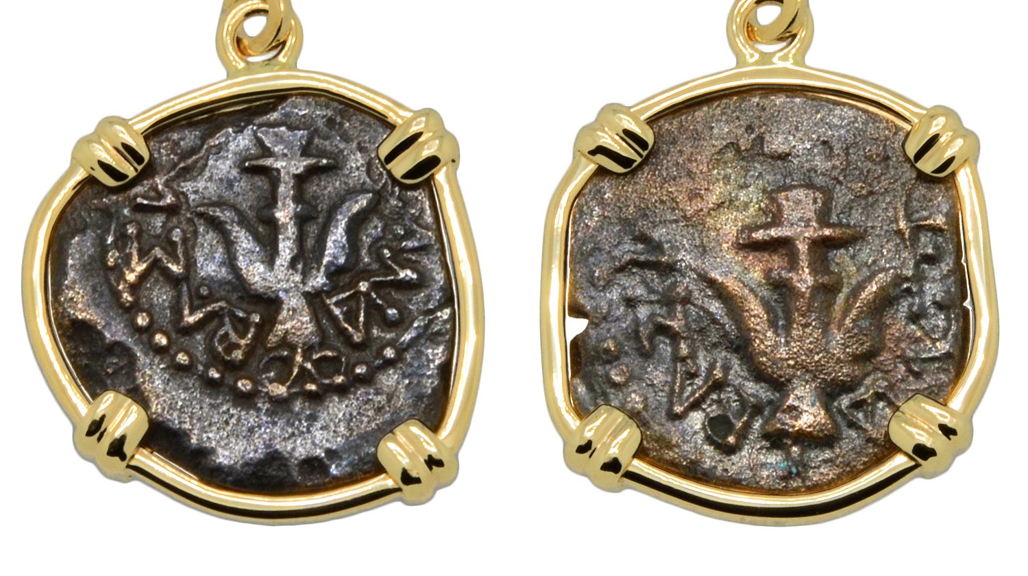 These small bronze coins called prutah, were minted in Judaea during the first century BC and were common currency used during the time of Christ. There is an anchor on one side and a star on the reverse. A loaf of bread during this time was worth about ten prutah coins.